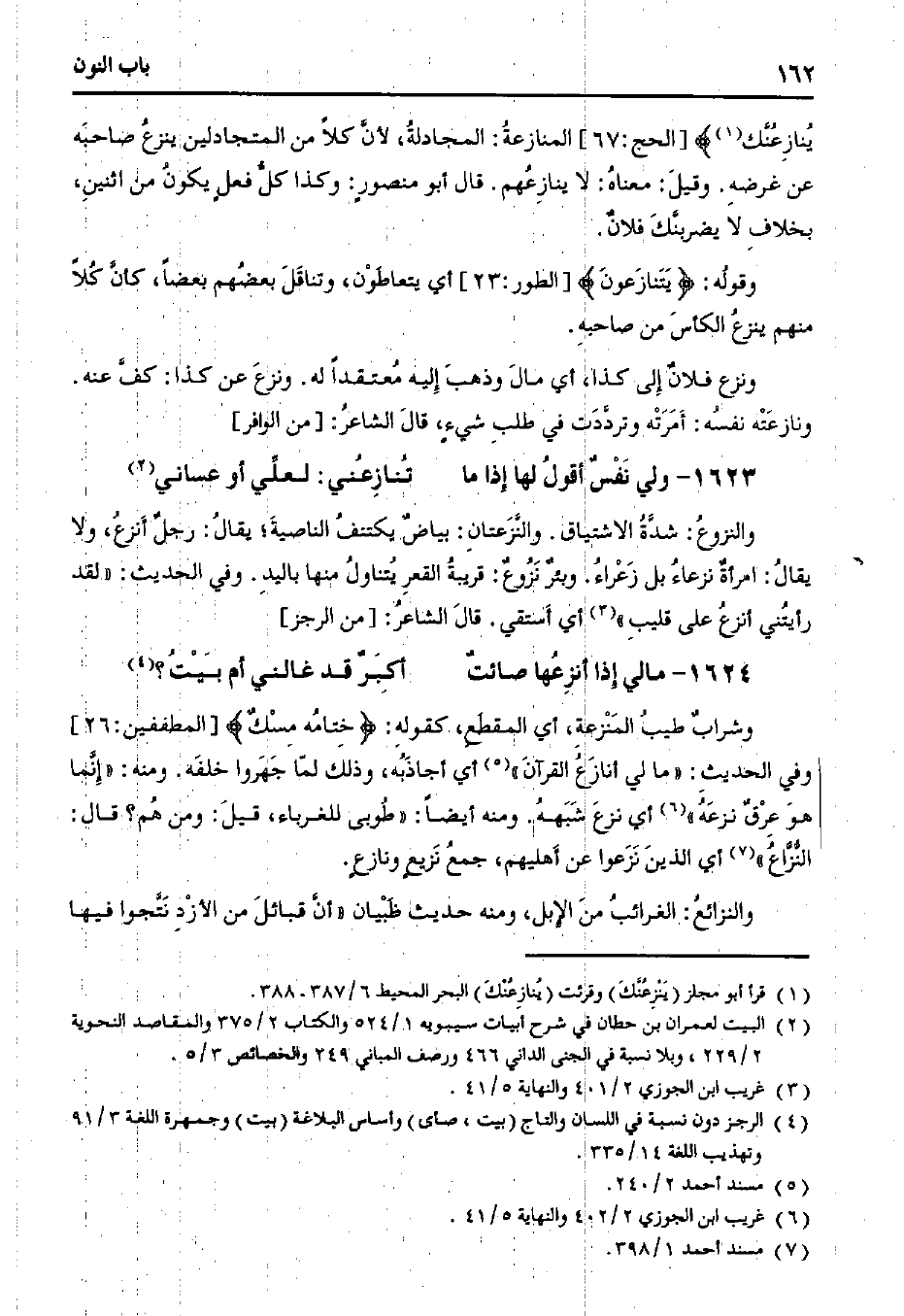 ينازعنك} [الحج: 67] المنازعة: المجادلة، لأن كلاً من المتجادلين ينزع صاحبه عن غرضه. وقيل: معناه: لا ينازعهم. قال أبو منصورٍ: وكذا كل فعلٍ يكون من اثنين، بخلاف لا يضربنك فلان.