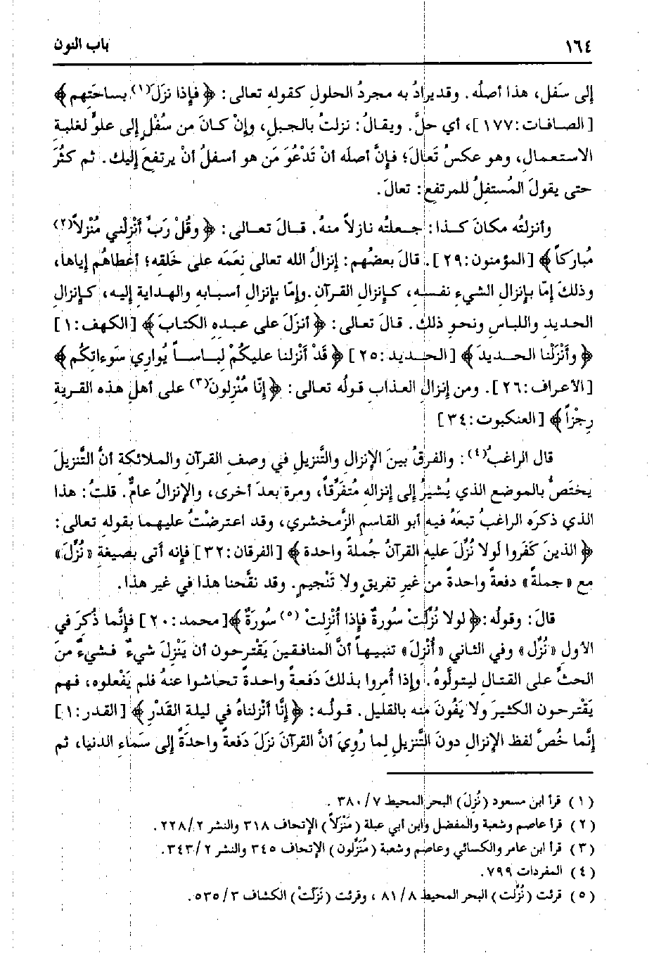قال الراغب: والفرق بين الإنزال والتنزيل في وصف القرآن والملائكة أن التنزيل يختص بالموضع الذي يشير إلى إنزاله متفرقًا، ومرة بعد أخرى، والإنزال عام. قلت: هذا الذي ذكره الراغب تبعه فيه أبو القاسم الزمخشري، وقد اعترضت عليها بقوله تعالى: {الذين كفروا لولا نزل عليه القرآن جملة واحدة} [الفرقان: 32] فإنه أتى بصيغة ((أنزل)) مع ((جملة)) دفعة واحدة من غير تفريق ولا تنجيم. وقد نقحنا في غير هذا.