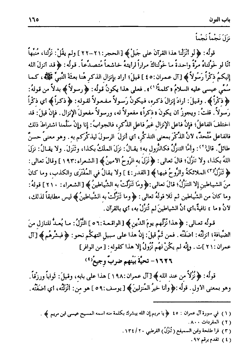 قوله: {لو أنزلنا هذا القرآن على جبل} [الحجر: 21 - 22] ولم يقل: نزلنا، منبهًا أنا لو خولناه مرة واحدة ما خولناك مرارًا لرأيته خاشعًا متصدعًا. قوله: {قد أنزل الله إليكم ذكرًا رسولًا} [آل عمران: 45] قيل؛ أراد بإنزال الذكر هنا بعثة النبي صلى الله عليه وسلم، كما سمي عيسى عليه السلام ((كلمة)).فعلى هذا يكون قوله: {رسولًا} بدلا من قوله: {ذكرًا}. وقيل: أراد إنزال ذكره، فيكون رسولًا مفعولًا لقوله: {ذكرًا} أي ذكرًا رسولًا. قلت ويجوز أن يكون ((ذكرًا)) مفعولًا له، ورسولًا مفعول الإنزال. فإن قل: قد اختلف الفاعل؛ فإن فاعل الإنزال غير فاعل الذكر، فالجواب: إنا وإن سلمنا اشتراط ذلك فالفاعل متحد، لأن الذكر بمعنى التذكر، أي أنزل الرسول ليذكركم به. وهو معنى حسن طائل. قال: وأما التنزل فكالنزول به؛ يقال: نزل الملك بكذا، وتنزل. ولا يقال: نزل الله بكذا، ولا تنزل؛ قال تعالى: {نزل به الروح الأمين} [الشعراء: 193] وقال تعالى: {تنزل الملائكة والروح فيها} [القدر: 4] ولا يقال في المفترى والكذب، وما كان من الشياطين إلا التنزل؛ قال تعالى: {وما تنزلت به الشياطين} [الشعراء: 210] قوله: وما كان من الشياطين ثم تلا قوله تعالى: {وما تنزلت به الشياطين} ليس مطابقا لذلك، لأن ((ما)) نافية، أي أن الشياطين لم تنزل به، أي بالقرآن.