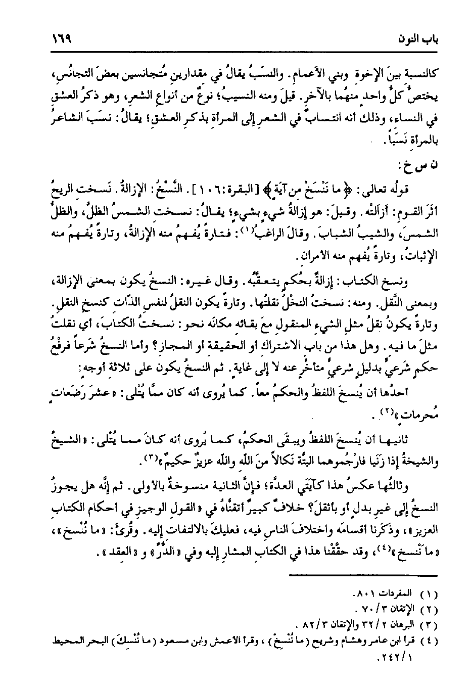قوله تعالى: {مما ننسخ من آية} [البقرة: 106]. النسخ: الإزالة. نسخت الريح أثر القوم: أزالته. وقيل: هو إزالة شيء بشيء؛ يقال: نسخت الشمس الظل، والظل الشمس، والشيب الشباب. وقال الراغب: فتارة يفهم منه الإزالة، وتارة يفهم منه الإثبات، وتارة يفهم منه الأمران.