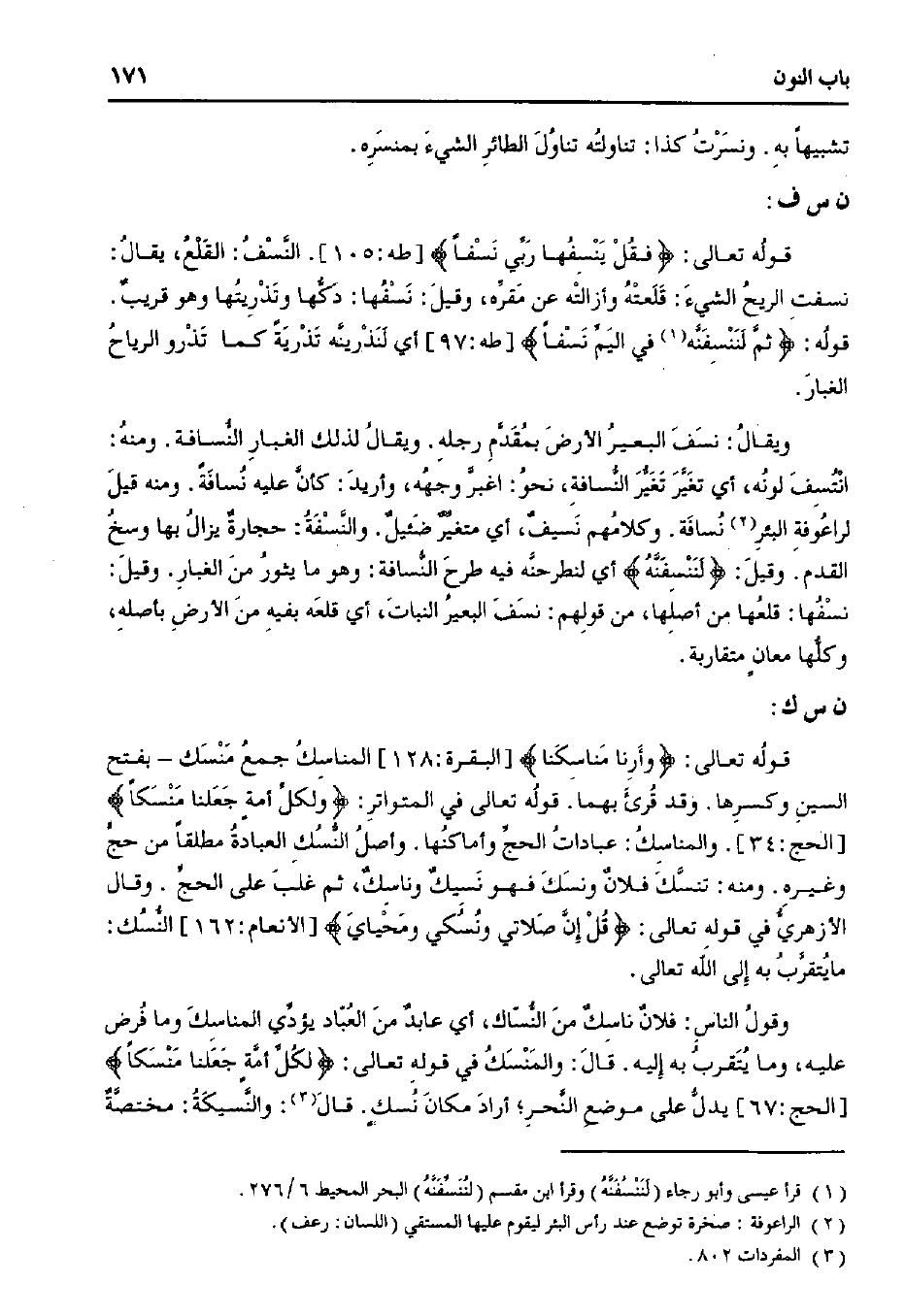 ويقال: نسف البعير الأرض بمقدم رجله. ويقال لذلك الغبار النسافة. ومنه انتسف لونه، أي تغير تغير النسافة، نحو/ اغبر وجهه، وأريد: كأن عليه نسافة. ومنه قيل لراعوفة البئر نسافة، وكلامهم نسيف. أي متغير ضئيل. والنسفة: حجارة يزال بها وسخ القدم. وقيل: {لننسفنه} أي لنطرحه فيه طرح النسافة: وهو ما يثور من الغبار. وقيل: نسفها: قلعها من أصلها، من قولهم: نسف البعير النبات، أي قلعه بفيه من الأرض بأصله، وكلها معان متقاربة.