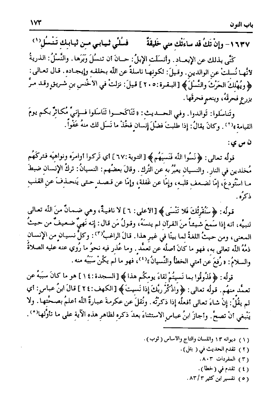 قوله: {فذوقوا بما نسيتم لقاء يومكم هذا} [السجدة: 14] هو ما كان سببه عن تعمد منهم. قوله تعالى: {واذكر ربك إذا نسيت} [الكهف: 24] قال ابن عباس: أي لم يقل: إن شاء تعالى أفعله إذا ذكرنه. ونقل عن عكرمة عبارة الله أعلم بصحتها. ولا ينبغي أن تصح. وأجاز ابن عباس الاستثناء بعد ذكره لظاهر هذه الآية على ما تأولها.