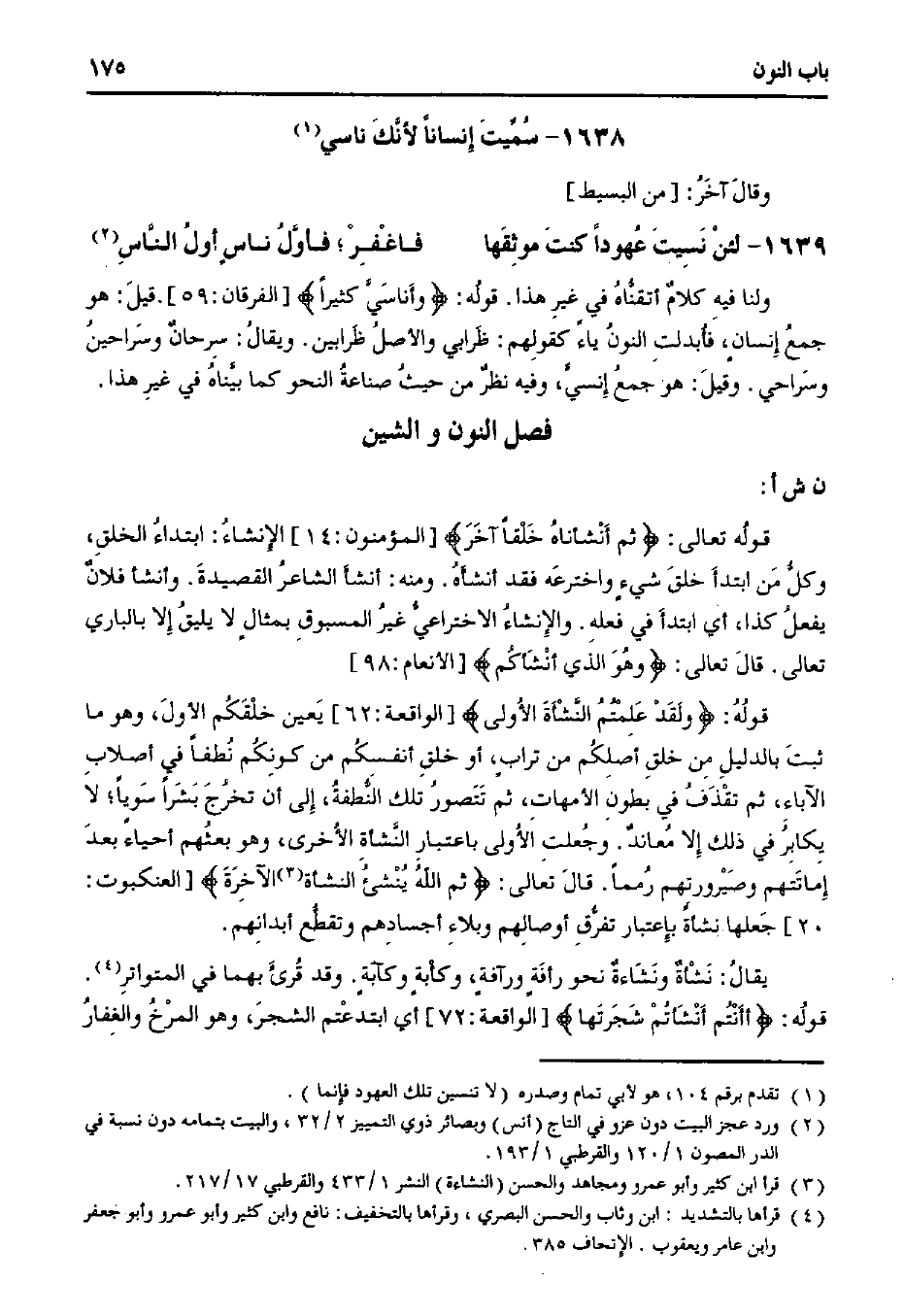 ولنا فيه كلام أتقناه في غير هذا. قوله: {وأناسي كثيرًا} [الفرقان: 59]. قيل: هو جمع إنسانٍ، فأبدلت النون ياء كقولهم: ظرابي والأصل ظرابين. ويقال: سرحان وسراحين وسراحي. وقيل: هو جمع إنسي، وفيه نظر من حيث صناعة النحو كما بيناه في غير هذا.