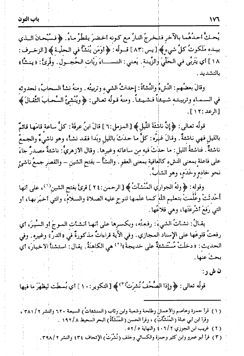 يقال: نشأت الشيء: رفعته، وبكسرها على أنها أنشأت الموج أو السير، أي رفعت قلوعها على الإسناد المجازي. وفي الآية قراءات مذكورة في ((الدر)) وغيره. وفي الحديث: ((دخلت مستنشئة على خديجة)) هي الكاهنة. يقال: استشنأ الأخبار، أي بحث عنها.