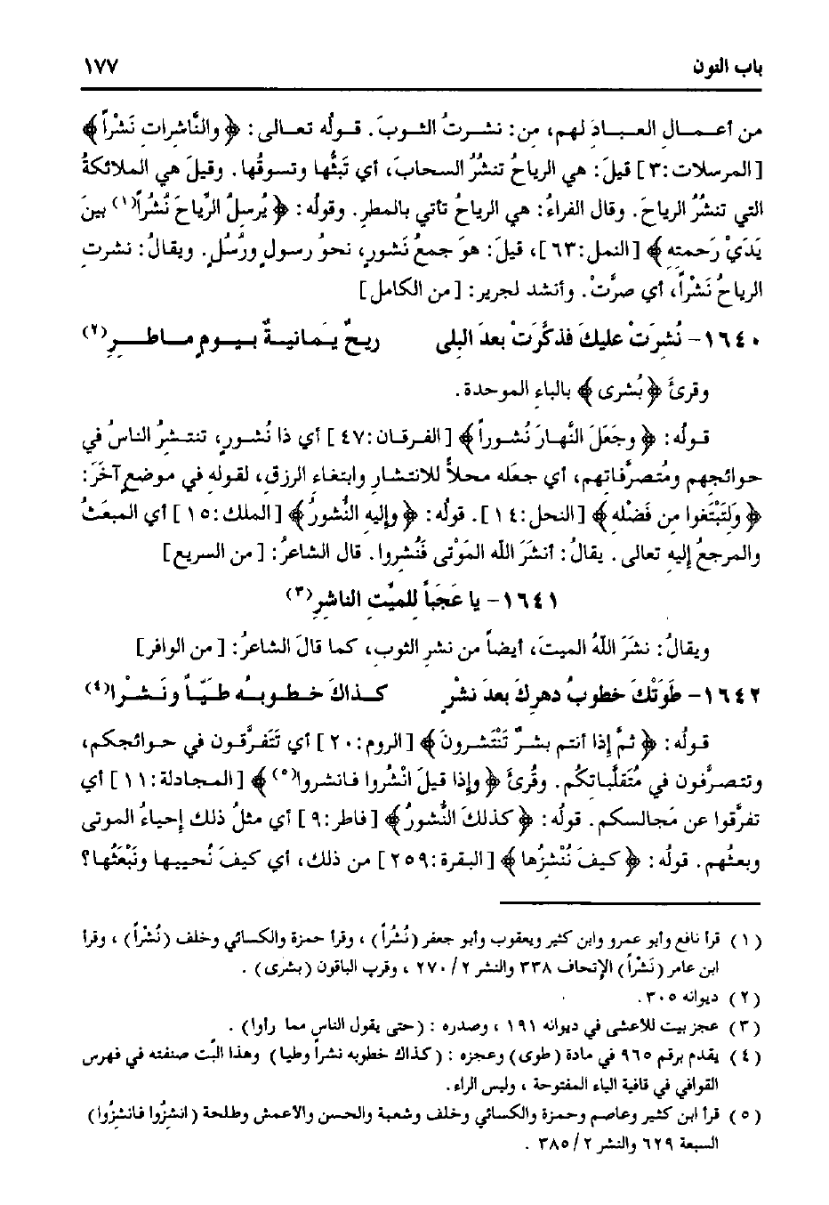 قوله: {وجعل النهار نشورًا} [الفرقان: 47] أي ذا نشورٍ، تنتشر الناس في حوائجهم ومتصرفاتهم، أي جعله محلاً للانتشار وابتغاء الرزق، لقوله في موضعٍ آخر: {ولتبتغوا من فضله} [النحل: 14]. قوله: {وإليه النشور} [الملك: 15] أي المبعث والمرجع إليه تعالى. يقال: أنشر الله الموتى فنشروا. قال الشاعر: [من السريع]