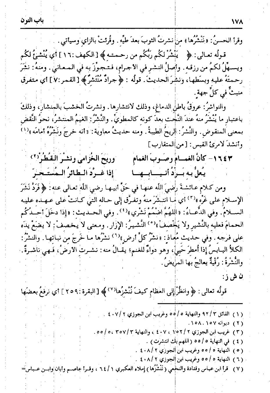 ومن كلام عائشة رضي الله عنها في حق أبيها رضي الله تعالى عنه: {فرد نشر الإسلام على غرة» أي ما انتشر منه وتفرق إلى حاله التي كانت على عهده عليه السلام. وفي الدعاء: «اللهم اضمم نشري». وفي الحديث: «إذا دخل أحدكم الحمام فعليه بالنشير ولا يخصف» النشير: الإزار. ومعنى لا يخصف: لا يضع يده على فرجه. وفي حديث معاذٍ: «نشر كل أرضٍ» نشرها ما خرج من نباتها. والنشر: الكلأ اليابس إذا أمطر حيي، وهو دواء للغنم؛ يقال منه: نشرت الأرض، فهي ناشرة. والنشرة: رقية يعالج بها المريض.