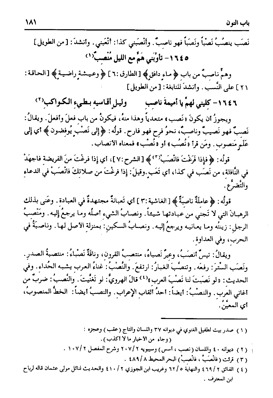 ويقال: تيس أنصب، وعير نصباء، منتصب القرون، وناقة نصباء: منتصبة الصدر. ونصب الستر: رفعه: وتنصب الغبار: ارتفع. والنصب: غناء العرب يشبه الحداء. وفي الحديث: «لو نصبت لنا نصب العرب» قال الهروي: لو تغنيت. والنصب: ضرب من أغاني العرب. والنصب: أيضًا: أحد ألقاب الإعراب. والنصب أيضًا: الخط المنصوب، أي المعين.