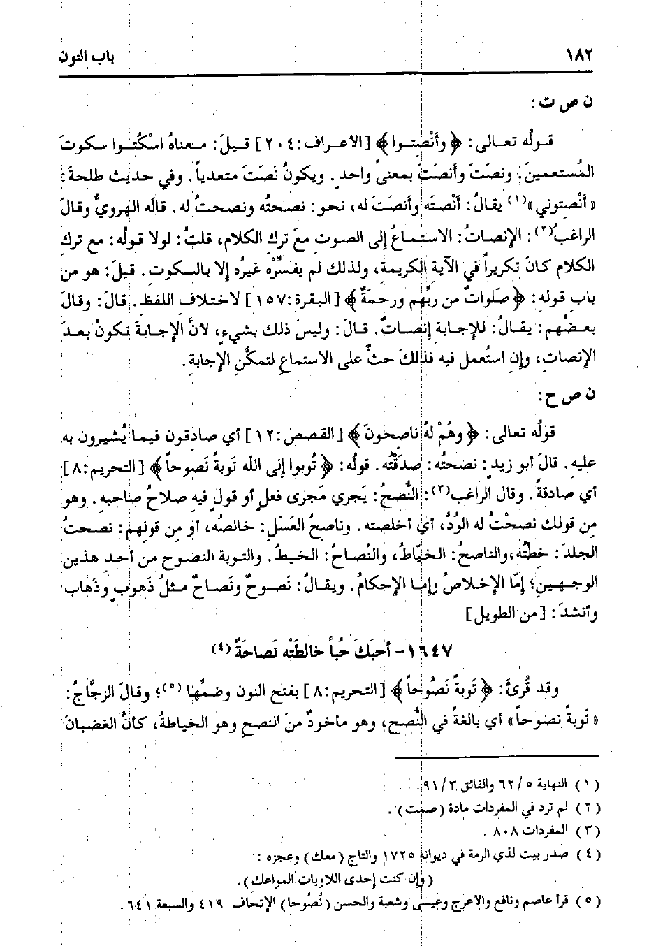 قوله تعالى: {وهم له ناصحون} [القصص: 12] أي صادقون فيما يشيرون به عليه. قال أبو زيدٍ: نصحته: صدقته. قوله: {توبوا إلى الله توبةً نصوحًا} [التحريم: 8] أي صادقةً. وقال الراغب. النصح: يجري مجرى فعلٍ أو قولٍ فيه صلاح صاحبه. وهو من قولك نصحت له الود، أي أخلصته. وناصح العسل: خالصه، أو من قولهم: نصحت الجلد: خطته، والناصح: الخياط، والنصاح: الخيط. والتوبة النصوح من أحد هذين الوجهين؛ إما الإخلاص وإما الإحكام. ويقال: نصوح ونصاح مثل ذهوبٍ وذهاب وأنشد: [من الطويل]