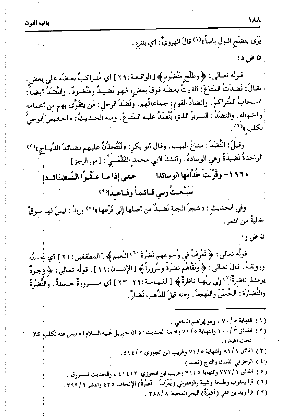 قوله تعالى: {تعرف في وجوههم نضرة النعيم} [المطففين: 24] أي حسنه ورونقه. قال تعالى: {ولقاهم نضرةً وسرورًا} [الإنسان: 11]. قوله تعالى: {وجوه يومئذٍ ناضرة إلى ربها ناظرة} [القيامة: 22 - 23] أي مسرورة حسنة. والنضرة والنضارة: الحسن والبهجة. ومنه قيل للذهب نضار.