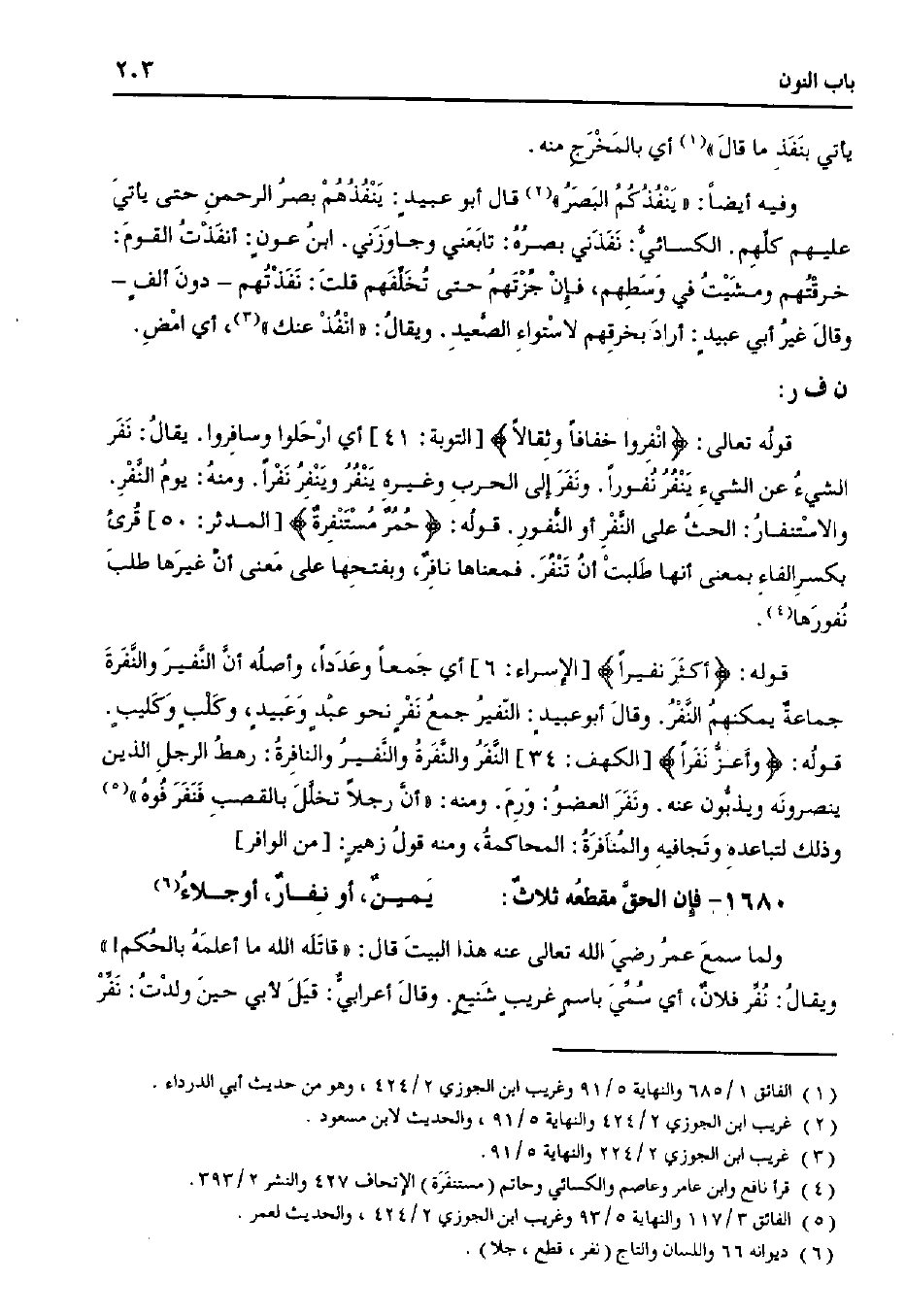 قوله: {أكثير نفيرًا} [الإسراء: 6] أي جمعيصا وعددًا، وأصله أن النفير والنفرة جماعة يمكنهم النفر. وقال أبو عبيدٍ: النفير جمع نفرٍ نحو عبدٍ وعبيدٍ، وكلبٍ وكليبٍ. قوله: {وأعز نفرًا} [الكهف: 34] النفر والنفرة والنفير والنافرة: رهط الرجل الذي ينصرون ويذبون عنه. ونفر العضو: ورم. ومنه: «أن رجلًا تخلل بالقصب فنفر فوه» وذلك لتباعده وتجافيه والمنافرة: المحاكمة، ومنه قول زهيرٍ: [من الوافر]