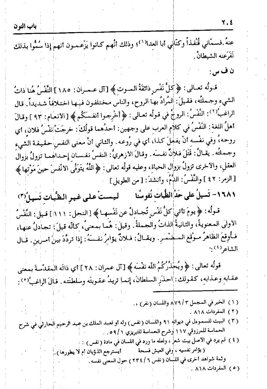 قوله تعالى: {كل نفسٍ ذائقة الموت} [آل عمران: 185] النفس هنا ذات الشيء وجملته، فقيل: المراد بها الروح، والناس مختلفون فيها اختلافًا شديدًا. قال الراغب: النفس: الروح في قوله تعالى: {أخرجوا أنفسكم} [الأنعام: 93] وقال أهل اللغة: النفس في كلام العرب على وجهين: أحدهما قولك: خرجت نفس فلانٍ، أي روحه، وفي نفسه أن يفعل كذا، أي في روعه. والثاني أن معنى النفس حقيقة الشيء وجملته. يقال: قتل فلان نفسه. وقال الأزهري: النفس نفسان إحداهما تزول بزوال العقل، والأخرى ترزول بزوال الحياة، وعليه قوله تعالى: {الله يتوفى الأنفس حين موتها} [الزمر: 42] والنفس: الدم، وأنشد: [من الطويل]