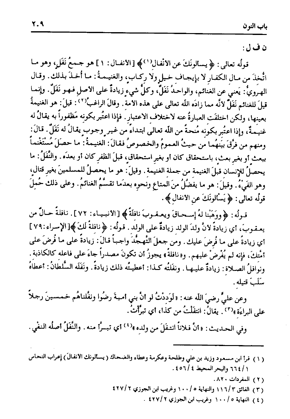 قوله تعالى: {يسألونك عن الأنفال} [الأنفال: 1] هو جمع نفلٍ، وهو ما اتخذ من مال الكفار لا بإيجاف خيلٍ ولا ركابٍ، والغنيمة: ما أخذ بذلك. وقال الهروي: يعني عن الغنائم، والواحد نفلٌ، وكل شيءٍ زيادةٌ على الأصل فهو نفلٌ. وإنما قيل للغنائم نفلٌ لأنه مما زاده الله تعالى على هذه الأمة. وقال الراغب: قيل: هو الغنيمة بعينها، ولكن اختلفت العبارة عنه لاختلاف الاعتبار. فإذا اعتبر بكونه مظفورًا به يقال له غنيمةٌ، وإذا اعتبر بكونه منحةً من الله تعالى ابتداءً من غيرٍ وجوبٍ يقال له نفلٌ. قال: ومنهم من فرق بينهما من حيث العموم والخصوص فقال: الغنيمة: ما حصل مستغنمًا ببعثٍ أو بغير بعثٍ، باستحقاق كان أو بغير استحقاقٍ، قبل الظفر كان أو بعده. والنفل: ما يحصل للإنسان قبل الغنيمة من جملة الغنيمة. وقيل: هو مايحصل للمسلمين بغير قتالٍ، وهو الفيء. وقيل: هو ما يفضل من المتاع ونحوه بعدما تقسم الغنائم. وعلى ذلك حمل قوله تعالى: {يسألونك عن الأنفال}.