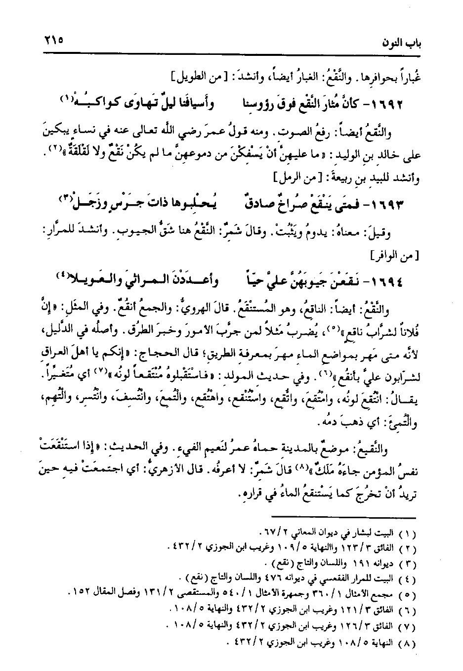 والنقع أيضًا: رفع الصوت. ومنه قول عمر رضي الله تعالى عنه في نساءٍ يبكين على خالد بن الوليد: «ما عليهن أن يسفكن من دموعهن ما لم يكن نقعٌ ولا لقلقةٌ». وأنشد للبيد بن ربيعة: [من الرمل]