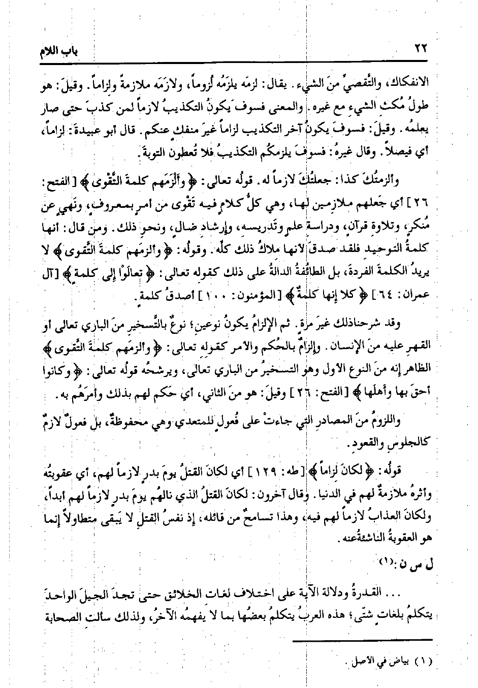 وألزمتك كذا: جعلتك لازمًا له. قوله تعالى:} وألزمهم كلمة التقوى {[الفتح: 26] أي جعلهم ملازمين لها، وهي كل كلامٍ فيه تقوى من أمرٍ بمعروفٍ، ونهيٍ عن منكرٍ، وتلاوة قرآنٍ، ودراسة علمٍ وتدريسه، وإرشاد ضالٍ، ونحو ذلك. ومن قال: أنها كلمة التوحيد فلقد صدق لأنها ملاك ذلك كله. وقوله:} وألزمهم كلمة التقوى {لا يريد الكلمة الفردة، بل الطائفة الدالة على ذلك كقوله تعالى:} تعالوا إلى كلمةٍ {[آل عمران: 64]} كلا إنها كلمة {[المؤمنون: 100] أصدق كلمةٍ.