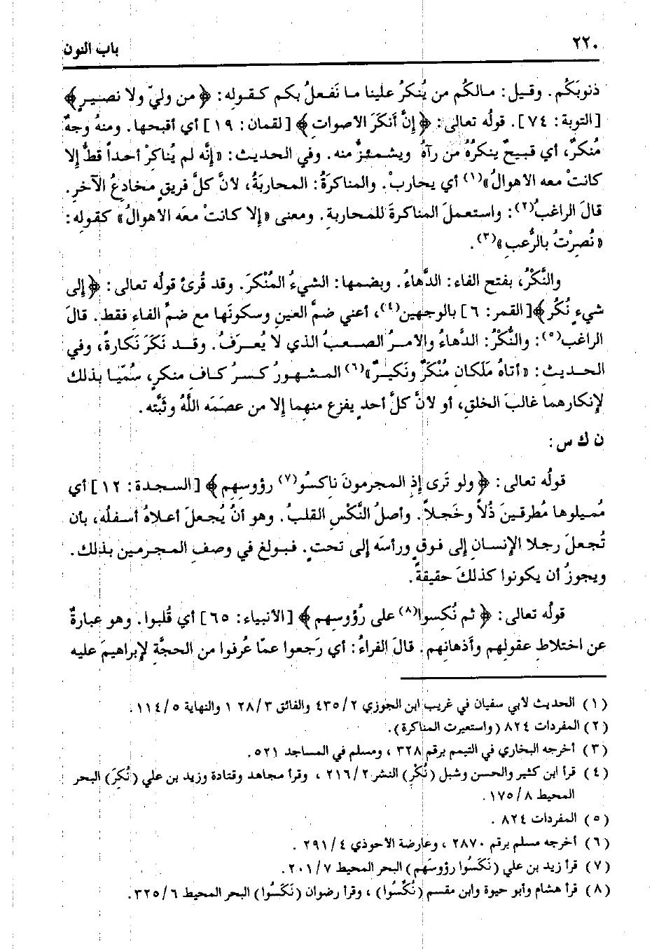 ذنوبكم. وقيل: مالكم من ينكر علينا ما نفعل بكم كقوله: {من ولي ولا نصير} [التوبة: 74]. قوله تعالى: {إن أنكر الأصوات} [لقمان: 19] أي أقبحها. ومنه وجهٌ منكرٌ، أي قبيحٌ ينكره من رآه ويشمئز منه. وفي الحديث: «إنه لم يناكر أحدًا قط إلا كانت معه الأهوال» أي يحارب. والمناكرة: المحاربة، لأن كل فريقٍ مخادع الآخر. قال الراغب: واستعمل المناكرة للمحاربة. ومعنى «إلا كانت معه الأهوال» كقوله: «نصرت بالرعب».