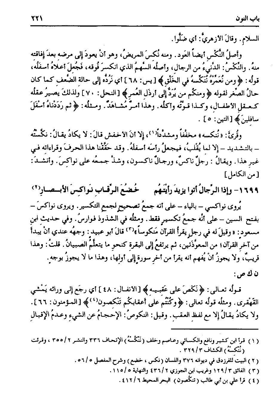 يروى نواكسي -بالياء - على أنه جمع تصحيحٍ لجمع التكسير. ويروى نواكس -بفتح السين -على أنه جمع تكسيرٍ فقط. ومثله في الشذوذ فوارس. وفي حديث ابن مسعودٍ: «وقيل له في رجل يقرأ القرآن منكوسًا» قال أبو عبيد: وجهه عندي أن يبدأ من آخر القرآن؛ من المعوذتين، ثم يرتفع إلى البقرة كنحو ما يتعلم الصبيان. قلت: هذا قريبٌ، ولا يجوز أن يفهم أنه يقرأ من أخر سورةٍ إلى أولها، وهذا ما لا يجوز بوجهٍ.