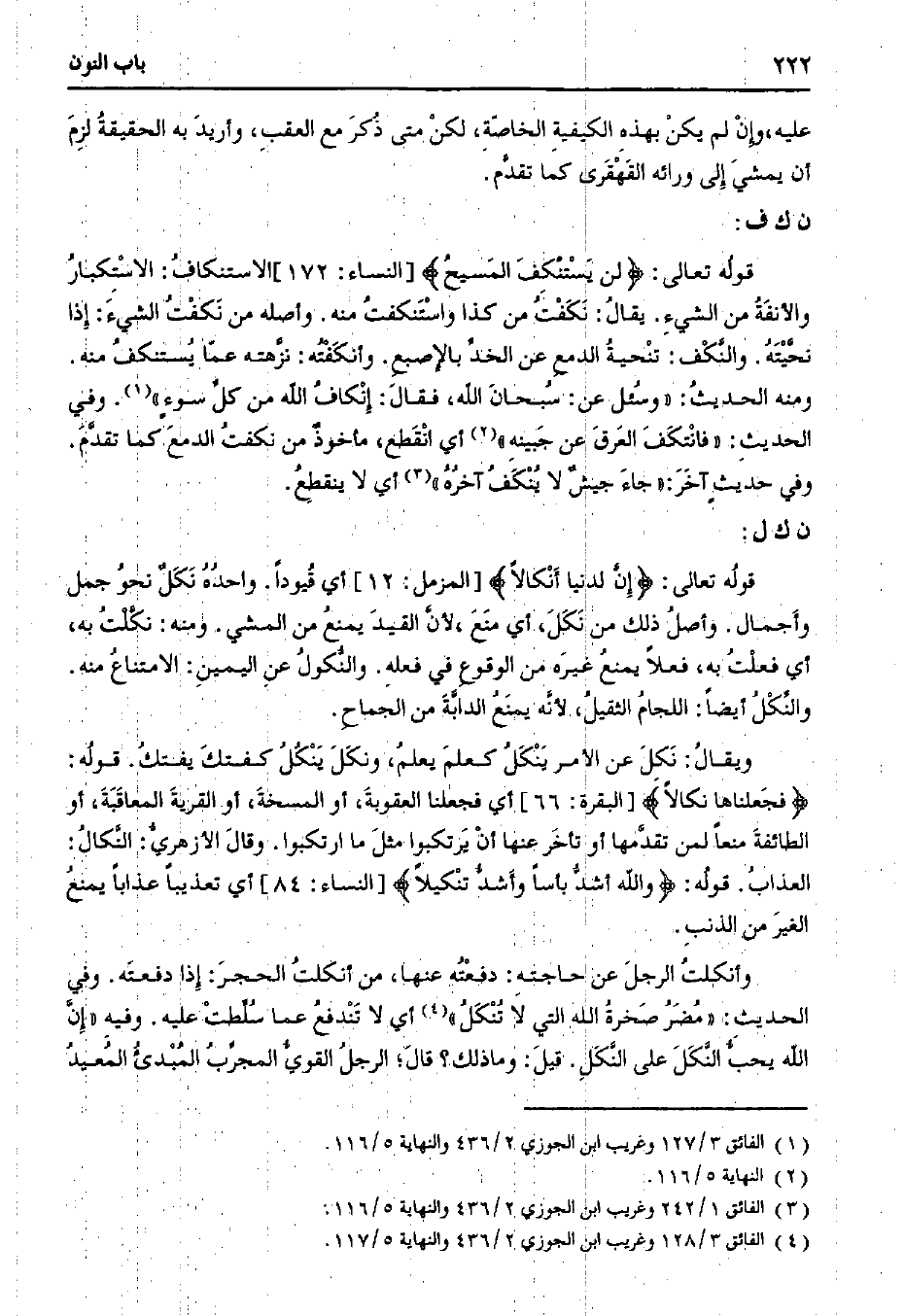قوله تعالى: {لن يستنكف المسيح} [النساء: 172] الاستنكاف: الاستكبار والأنفة من الشيء. يقال: نكفت من كذا واستنكفت منه. وأصله من نكفت الشيء: إذا نحيته. والنكف: تنحية الدمع عن الخد بالإصبع. وأنكفته: نزهته عما يستنكف منه. ومنه الحديث: «وسئل عن: سبحان الله، فقال: إنكاف الله من كل سوءٍ». وفي الحديث: «فانتكف العرق عن جبينه» أي انقطع، مأخوذٌ من نكفت الدمع كما تقدم. وفي حديث آخر: «جاء جيشُ لا ينكف آخره» أي لا ينقطع.