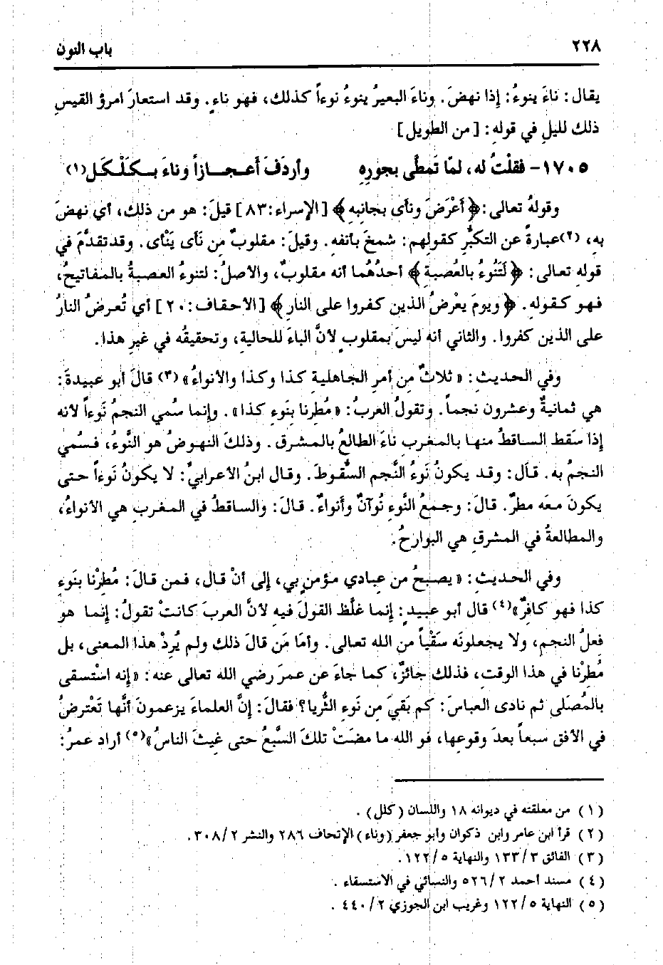 وفي الحديث: "ثلاث من أمر الجاهلية كذا وكذا والأنواء" قال أبو عبيدة: هي ثمانية وعشرون نجمًا. وتقول العرب: "مُطرنا بنوءٍ كذا". وإنما سُمي النجم نوءًا لأنه إذا سقط الساقط منها بالمغرب ناء الطالع بالمشرق. وذلك النهوض هو النوء، فسمي النجم به. قال: وقد يكون النجم السقوط. وقال ابن الأعرابي: لا يكون نوءًا حتى يكون معه مطر. قال: وجمع النوء يُصبح من عبادي مؤمن بي، إلى أن قال، فمن قال: مُطرنا بنوء كذا فهو كافر" قال أبو العبيد: إنما غلظ القول فيه لأن العرب كانت تقول: إنما هو فعل النجم، ولا يجعلونه سقيًا من الله تعالى. وأما من قال ذلك ولم يرد هذا المعنى، بل مُطرنا في هذا الوقت، فذلك جائز، كما جاء عن عمر رضي الله عنه: "إنه استسقى بالمصلي ثم نادى العباس: كم بقي من نوء الثريا؟ فقال: إن العلماء يزعمون أنها تعترض في الأفق سبعًا بعد فوقها، فو الله ما مضت تلك السبع غيث الناس" أراد عمر: