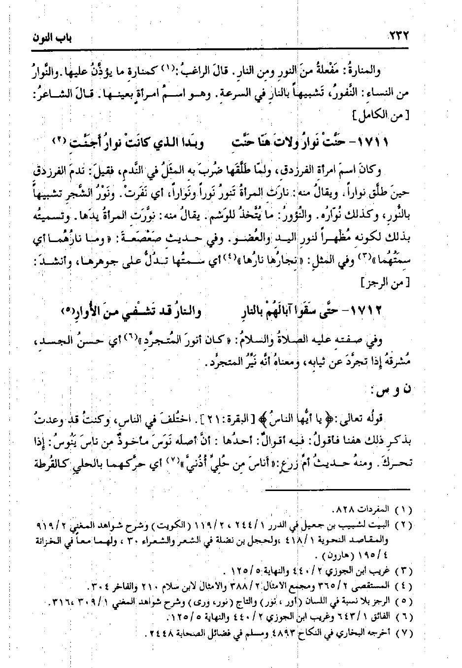وكان اسم امرأة الفرزدق، ولما طلقها ضرب به المثل في الندم، فقيل ندم الفرزدق حين طلق نوارا. ويقال منه: نارت المرأة تنور نورًا ونوارًا، أي نفرت. ونزر الشجر تشبيهًا بالنور، وكذلك نواره. والنؤور: ما يتخذ للوشم. يقال منه: نورت المرأة يدها. وتسميته بذلك لكونه مظهرًا لنور اليد والعضو. وفي حديث صعصعة: "وما نارهما أي سمتهما" وفي المثل: "نجارها نارها" أي سمتها تدل على جوهرها، وأنشد [من الرجز]