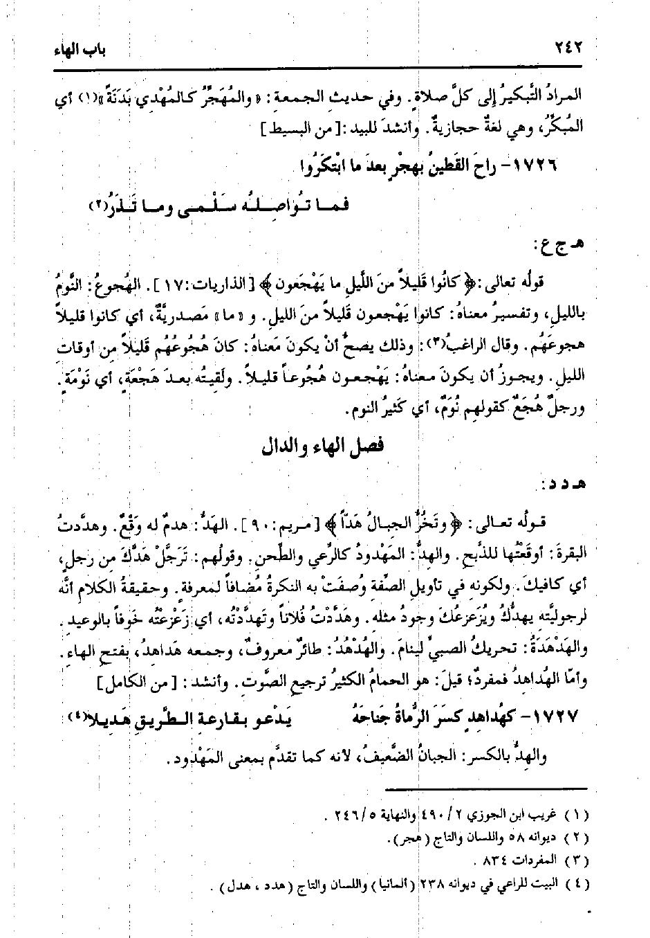 قوله تعالى: {وتخر الجبال هدًا} [مريم: 90]. الهد: هدم له وقع. وهددت البقرة: أوقعتها للذبح. والهد: المهدود كالرعي والطحن. وقولهم: ترجل هدك من رجلٍ، أي كافيك. ولكونه في تأويل الصفة وصفت به النكرة مضافًا لمعرفةٍ. وحقيقة الكلام أنه لرجوليته يهدك ويزعزعك وجود مثله. وهددت فلانًا وتهددته، أي زعزعته خوفًا بالوعيد. والهدهدة: تحريك الصبي لينام. والهدهد: طائر معروف، وجمعه هداهد، بفتح الهاء، وأما الهداهد فمفرد؛ قيل: هو الحمام الكثير ترجيع الصوت. وأنشد: [من الكامل].