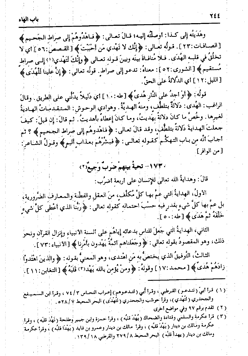 وهديته إلى كذا: أوصلته إليه؛ قال تعالى: {فأهدوهم إلى صراط الجحيم} [الصافات:23]. قوله تعالى: {إنك لا تهدي من أحببت} [القصص:56] أي لا تخلق في قلبه الهدى. فلا منافاة بينه وبين قوله تعالى {وإنك لتهدي إلى صراط مستقيم} [الشورى:52]: معناه: تدعو إلى صراطٍ. قوله تعالى: {إن علينا للهدى} [الليل:12] أي الدلالة على الحق.