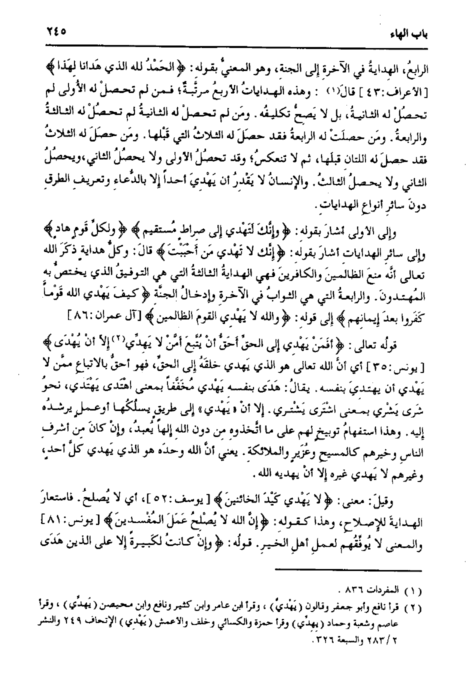 الرابع، الهداية في الآخرة إلى الجنة، وهو المعني بقوله: {الحمد لله الذي هدانا لهذا} [الأعراف:43] قال: وهذه الهدايات الأربع مرتبة؛ فمن لم تحصل له الأولى لم تحصل له الثانية، بل لا يصح تكليفه. ومن لم تحصل له الثانية لم تحصل له الثالثة والرابعة. ومن حصلت له الرابعة فقد حصل له الثلاث التي قبلها. ومن حصل له الثلاث فقد حصل له اللتان قبلها، ثم لا تنعكس؛ وقد تحصل الأولى ولا يحصل الثاني، ويحصل الثاني ولا يحصل الثالث. والإنسان لا يقدر أن يهدي أحداً إلا بالدعاء وتعريف الطرق دون سائر أنواع الهدايات.