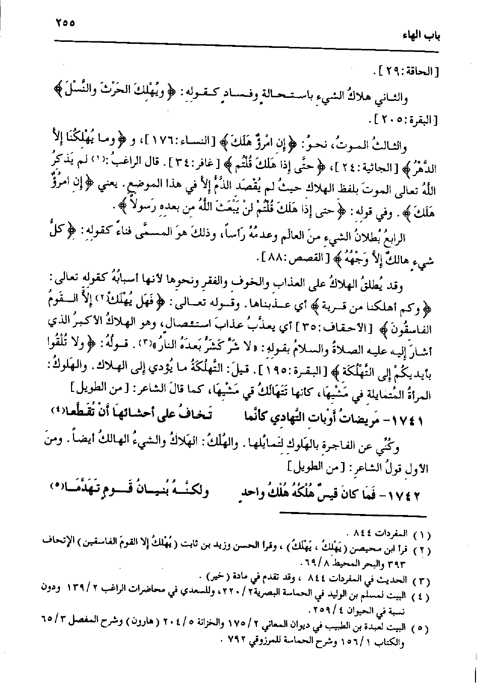 وقد يطلق الهلاك على العذاب والخوف والفقر ونحوها لأنها أسبابه كقوله تعالى: {وكم أهلكنا من قرية} أي عذبناها. وقوله تعالى: {فهل يهلك إلا القوم الفاسقون} [الأحقاف:35] أي يعذب عذاب اسئصالٍ، وهو الهلاك الأكبر الذي أشار إليه عليه الصلاة والسلام بقوله: "لا شر كشر بعده النار". قوله: {ولا تلقوا بأيديكم إلى التهلكة} [البقرة:195]. قيل: التهلكة ما يؤدي إلى الهلاك. والهلوك: المرأة المتمايلة في مشيها، كأنها تتهالك في مشيها، كما قال الشاعر: [من الطويل]