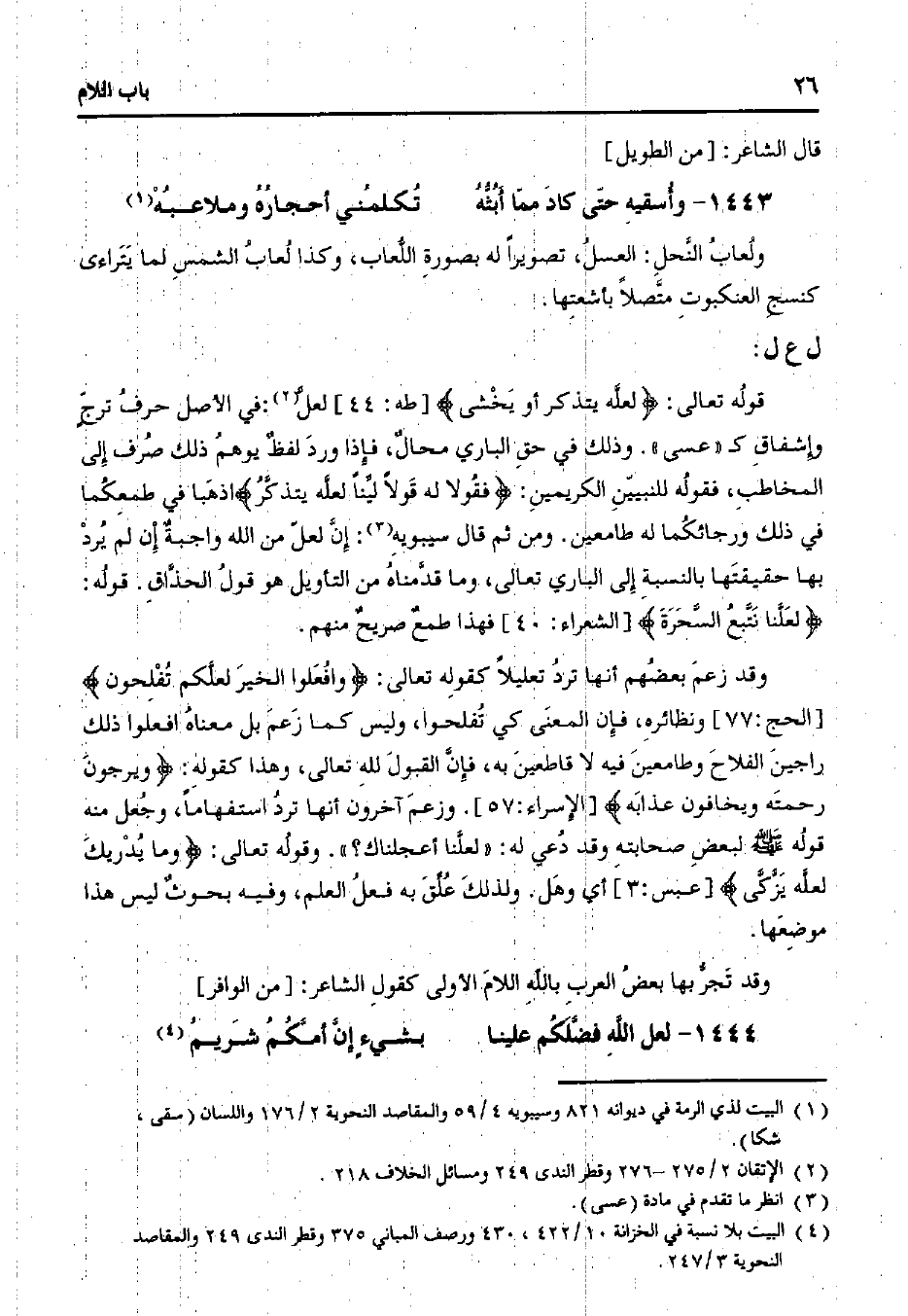 قوله تعالى:} لعله يتذكر أو يخشى {[طه: 44] لعل: في الأصل حرف ترجٍ وإشفاق كـ "عسى". وذلك في حق الباري محال، فإذا ورد لفظ يوهم ذلك صرف إلى المخاطب، فقوله للنبيين الكريمين:} فقولا له قولاً لينًا لعله يتذكر {اذهبا في طمعكما في ذلك ورجائكما له طامعين. ومن ثم قال سيبويه: إن لعل من الله واجبة إن لم يرد بها حقيقتها بالنسبة إلى الباري تعالى، وما قدمناه من التأويل هو قول الحذاق. قوله:} لعلنا نتبع السحرة {[الشعراء: 40] فهذا طمع صريح منهم.