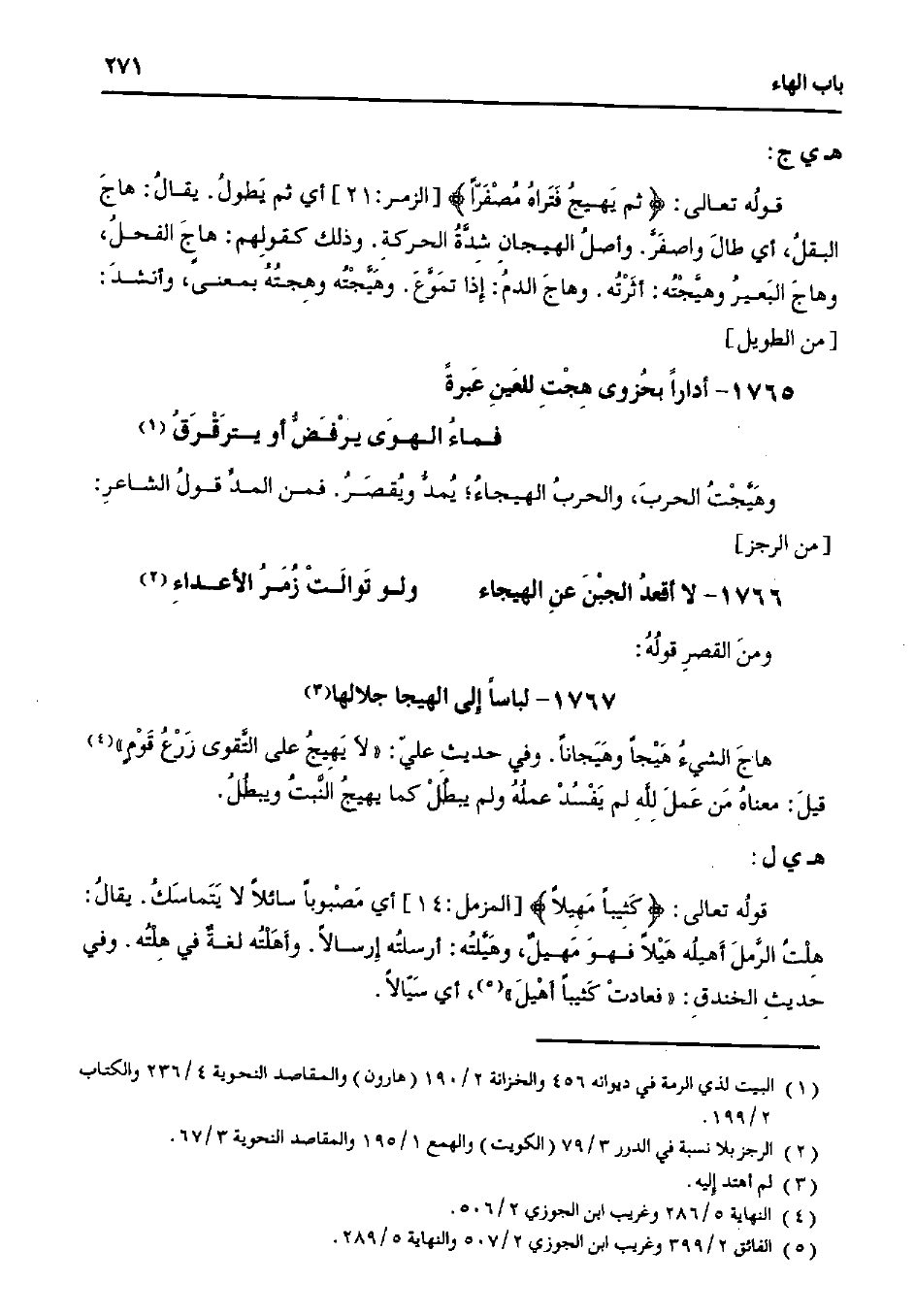 قوله تعالى: {ثم يهيج فتراه مصفرًا} [الزمر:21] أي ثم يطول. يقال: هاج البقل، أي طال واصفر. وأصل الهيجان شدة الحركة. وذلك كقولهم: هاج الفحل، وهاج البعير وهيجته: أثرته. وهاج الدم: إذا تموع. وهيجته وهجته بمعنى، وأنشد: [من الطويل]
