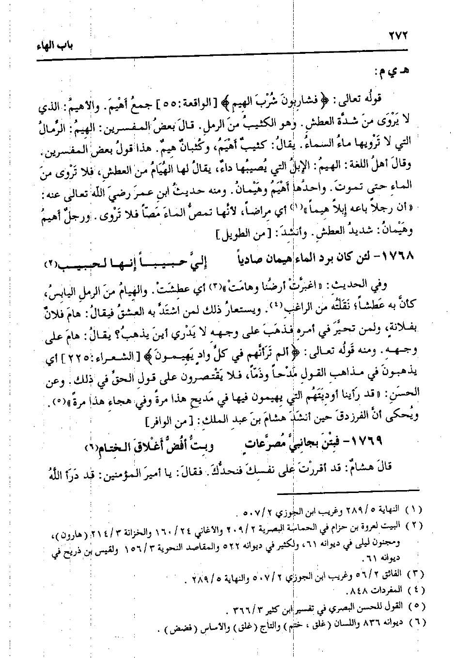 وفي الحديث: "اغبرت أرضنا وهامت" أي عطشت. والهيام من الرمل اليابس، كأنه به عطشًا؛ نقلته من الراغب. ويستعار ذلك لمن اشتد به العشق فيقال: هام فلان بفلانةٍ، ولمن تحير في أمره فذهب على وجهه لا يدري أين يذهب؟ يقال: هام على وجهه. ومنه قوله تعالى: {ألم ترأنهم في كل وادٍ يهيمون} [الشعراء:225] أي يذهبون في مذاهب القول مدحًا وذمًا، فلا يقتصرون على قول الحق في ذلك. وعن الحسن: "قد رأينا أوديتهم التي يهيمون فيها في مديح هذا مرة وفي هجاء هذا مرة".