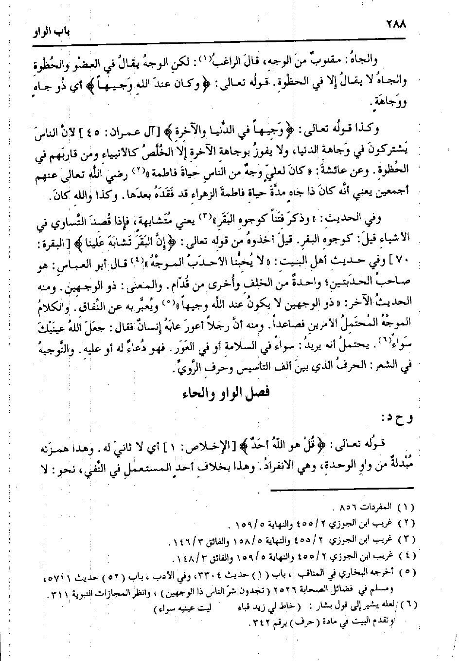 وفي الحديث: "وذكر فتنا كوجوه البقر" يعني متشابهة، فإذا قصد التساوي في الأشياء قيل: كوجوه البقر. قيل أخذوه من قوله تعالى: {إن البقرة تشابه علينا} [البقرة: 70] وفي حديث أهل البيت: "لا يحبنا الأحدب الموجه" قال أبو العباس: هو صاحب الحدبتين؛ واحدة من الخلف وأخرى من قدام. والمعنى: ذو الوجهين. ومنه الحديث الآخر: "ذو الوجهين لا يكون عند الله وجهيًا" ويعبر به عن النفاق. والكلام الموجه المحتمل الأمرين فصاعدًا. ومنه أن رجلا أعور عابه إنسان فقال: جعل الله عينيك سواء. يحتمل أنه يريد: سواء في السلامة أو في العور. فهو دعاء له أو عليه. والتوجيه في الشعر: الحرف الذي بين ألف التأسيس وحرف الروي.