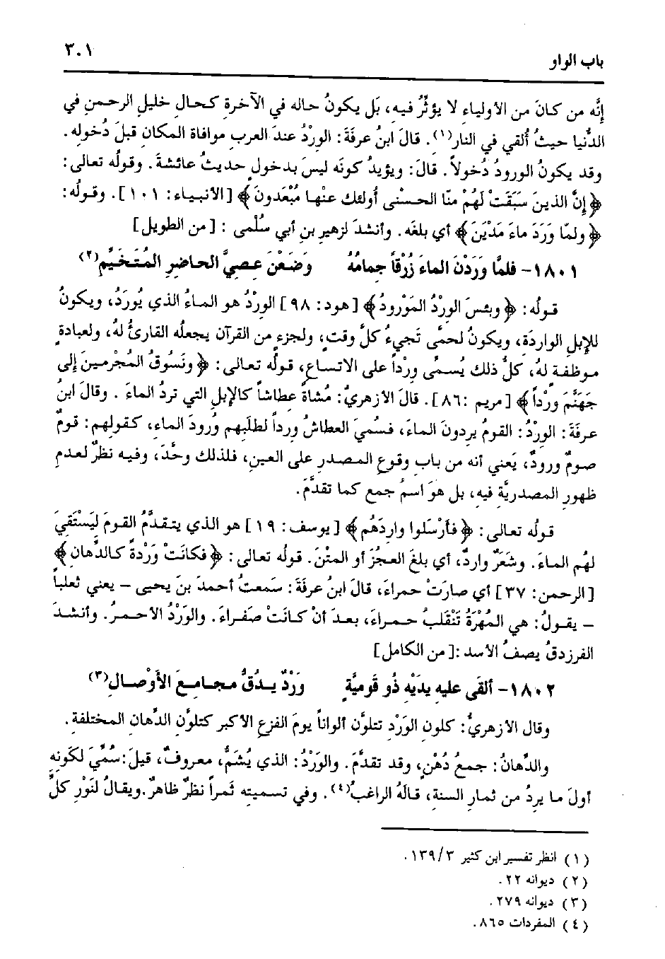 قوله تعالى: {فأرسلوا واردهم} [يوسف: 19] هو الذي يتقدم القوم ليستقي لهم الماء. وشعر وارد، أي بلغ العجز أو المتن. قوله تعالى: {فكانت وردةً كالدهان} [الرحمن: 37] أي صارت حمراء، قال ابن عرفة: سمعت أحمد بن يحيى -يعني ثعلبًا- يقول: هي المهرة تنقلب حمراء، بعد أن كانت صفراء. والورد الأحمر. وأنشد الفرزدق يصف الأسد: [من الكامل]
