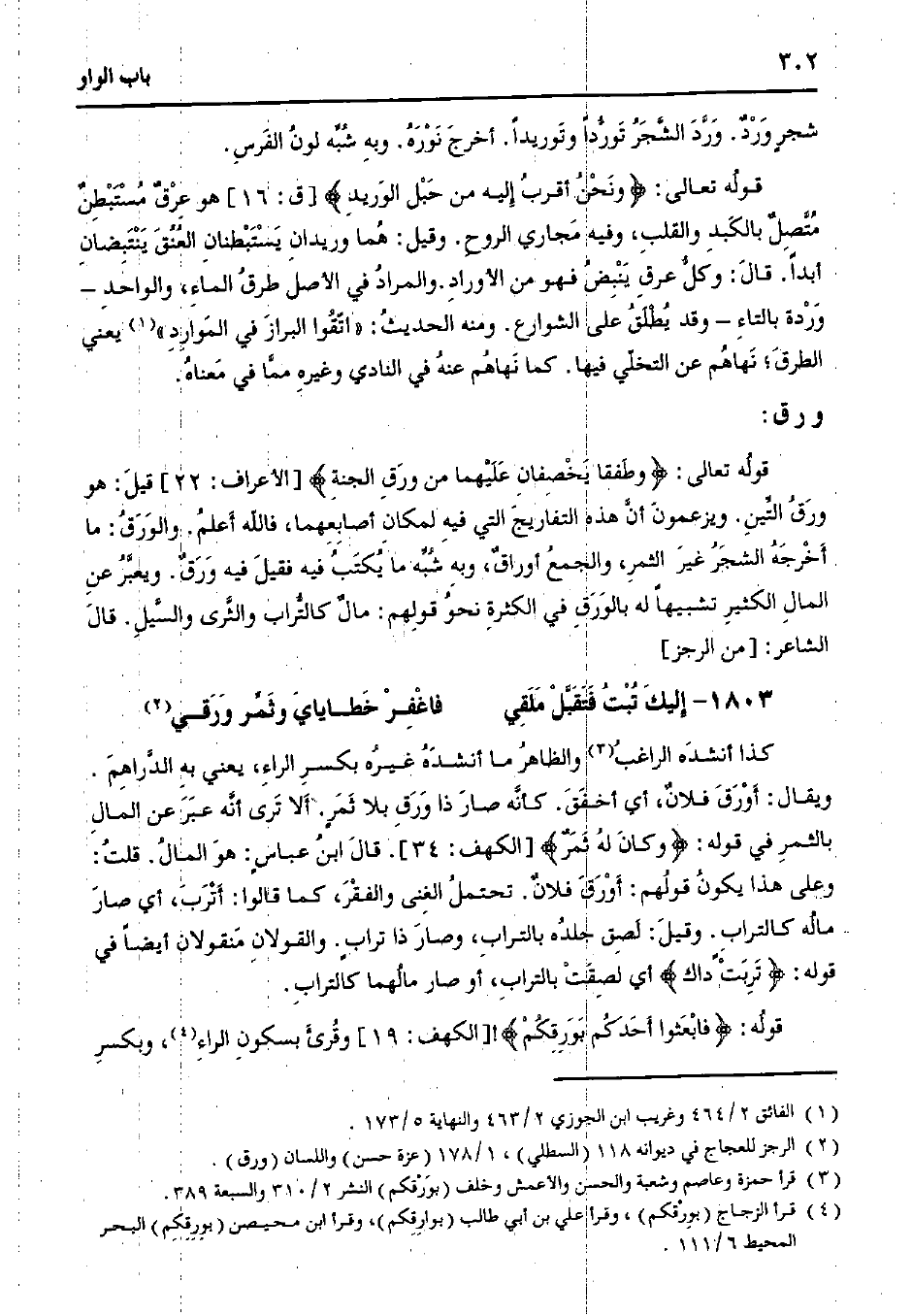 قوله تعالى: {وطفقا يخصفان عليهما من ورق الجنة} [الأعراف: 22] قيل: هو ورق التين. ويزعمون أن هذه التفاريج التي فيه لمكان أصابعهما، فالله أعلم. والورق: ما أخرجه الشجر غير الثمر، والجمع أوراق، وبه شبه ما يكتب فيه فقيل فيه ورق. ويعبر عن المال الكثير تشبهيًا له بالورق في الكثرة نحو قولهم: مال كالتراب والثرى والسيل. قال الشاعر: [من الراجز]