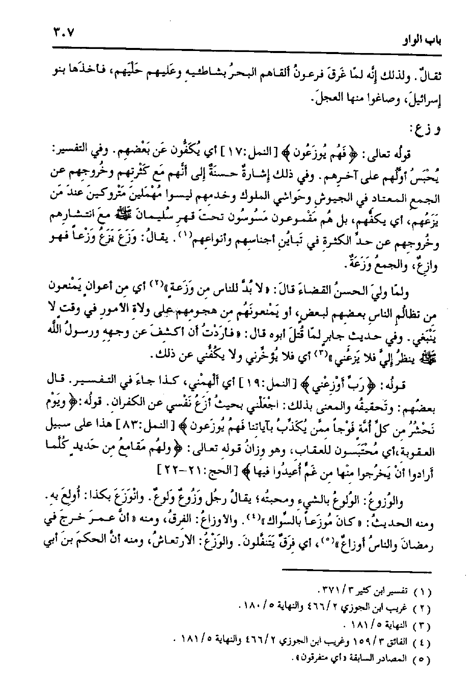 قوله: {رب أوزعني} [النمل: 19] أي ألهمني، كذا جاء في التفسير. قال بعضهم: وتحقيقه والمعنى بذلك: اجعلني بحيث أزع نفسي عن الكفران. قوله: {ويوم نحشر من كل أمةٍ فوجًا ممن يكذب بآياتنا فهم يوزعون} [النمل: 83] هذا على سبيل العقوبة، أي محتبسون للعقاب، وهو وزان قوله تعالى: {ولهم مقامع من حديدٍ كلما أرادوا أن يخرجوا منها من غم أعيدوا فيها} [الحج: 21 - 22].