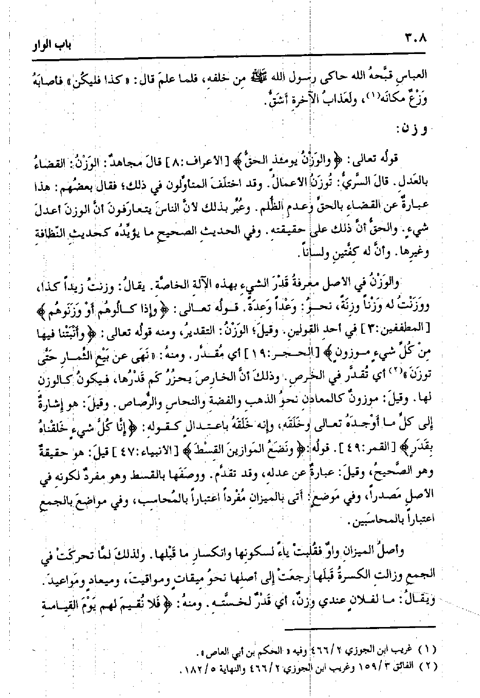 والوزن في الأصل معرفة قدر الشيء بهذه الآلة الخاصة. يقال: وزنت زيدًا كذا، ووزنت له وزنًا وزنةً، نحو: وعدًا وعدةً. قوله تعالى: {وإذا كالوهم أو وزنوهم} [المطففين: 3] في أحد القولين. وقيل؛ الوزن: التقدير، ومنه قوله تعالى: {وأنبتنا فيها من كل شيءٍ موزونٍ} [الحجر: 19] أي مقدر. ومنه: "نهى عن بيع الثمار حتى توزن" أي تقدر في الخرص. وذلك أن الخارص يحزر كم قدرها، فيكون كالوزن لها. وقيل: موزون كالمعادن نحو الذهب والفضة والنحاس والرصاص. وقيل: هو إشارة إلى كل ما أوجده تعالى وخلقه، وإنه خلقه باعتدالٍ كقوله: {إنا كل شيءٍ خلقناه بقدرٍ} [القمر: 49]. قوله: {ونضع الموازين القسط} [الأنبياء: 47] قيل: هو حقيقة وهو الصحيح، وقييل: عبارة عن عدله، وقد تقدم. ووصفها بالقسط وهو مفرد لكونه في الأصل مصدرًا، وفي موضعٍ: أتى بالميزان مفردًا اعتبارًا بالمحاسب، وفي مواضع بالجمع اعتبارًا بالمحاسبين.