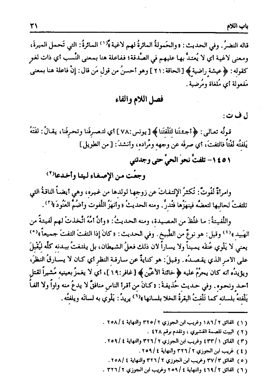 واللفيتة: ما غلظ من العصيدة، ومنه الحديث: "وأن أمة اتخذت لهم لفيتًة من الهبيد" وقيل: هو نوع من الطبيخ. وفي الحديث: "كان إذا التفت التفت جميعًا" يعني لا يلوي عنقه يمينًا ولا يسارًا لأن ذلك فعل الشيطان، بل يلتفت ببدنه كله ليقبل على الأمر الذي يقصده. وقيل: هو كناية عن سارقة النظر أي كان لا يسارق النظر، ويؤيده أنه كان يحرم عليه} خائنة الأعين {[غافر: 19]، أي لا يغمز بعينيه مشيرًا لقتل أحدٍ ونحوه. وفي حديث حذيفة: "كان من أقر الناس منافق لا يدع منه واوًا ولا ألفًا يلفته بلسانه كما تلفت البقرة الخلا بلسانها" يريد: يلوي به لسانه ويلفته.