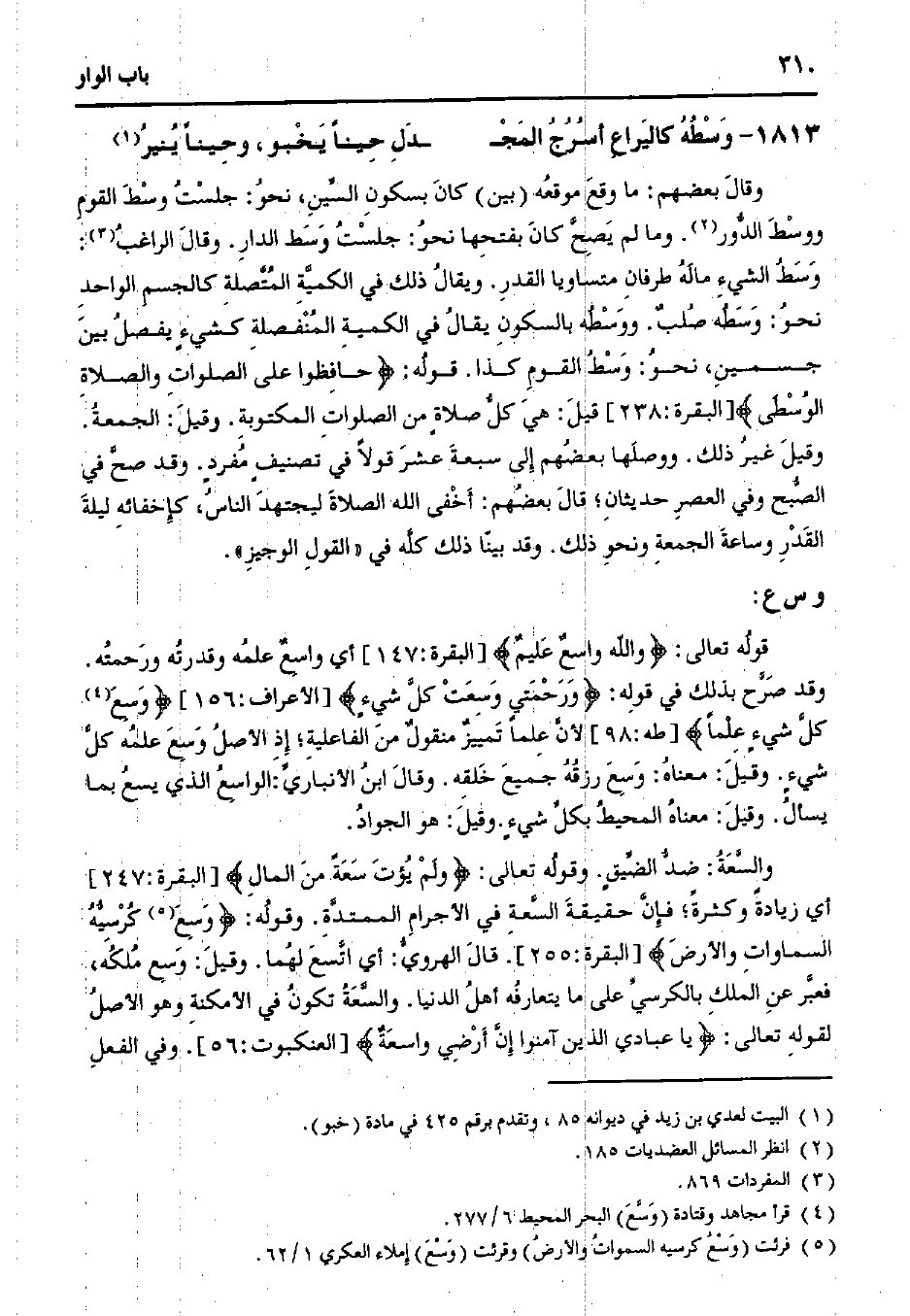 وقال بعضهم: ما موقع موقعه (بين) كان بسكون السين، نحو: جلست وسط القوم ووسط الدور. وما لم يصح كان بفتحها نحو: جلست وسط الدار. وقال الراغب: وسط الشيء ماله طرفان متساويا القدر. ويقال ذلك في الكمية المتصلة كالجسم الواحد نحو: وسطه صلب. ووسطه بالسكون يقال في الكمية المنفصلة كشيءٍ يفصل بين جسمين، نحو: وسط القوم كذا. قوله: {حافظوا على الصلوات والصلاة الوسطى} [البقرة: 238] قيل: هي كل صلاةٍ من الصلوات المكتوبة. وقيل: الجمعة. وقيل غير ذلك. ووصلها بعضهم إلى سبعة عشر قولاً في تصنيفٍ مفردٍ. وقد صح في الصبح وفي العصر حديثان؛ قال بعضهم: أخفى الله الصلاة ليجتهد الناس، كإخفائه ليلة القدر وساعة الجمعة ونحو ذلك. وقد بينّا كله في "القول الوجيز".