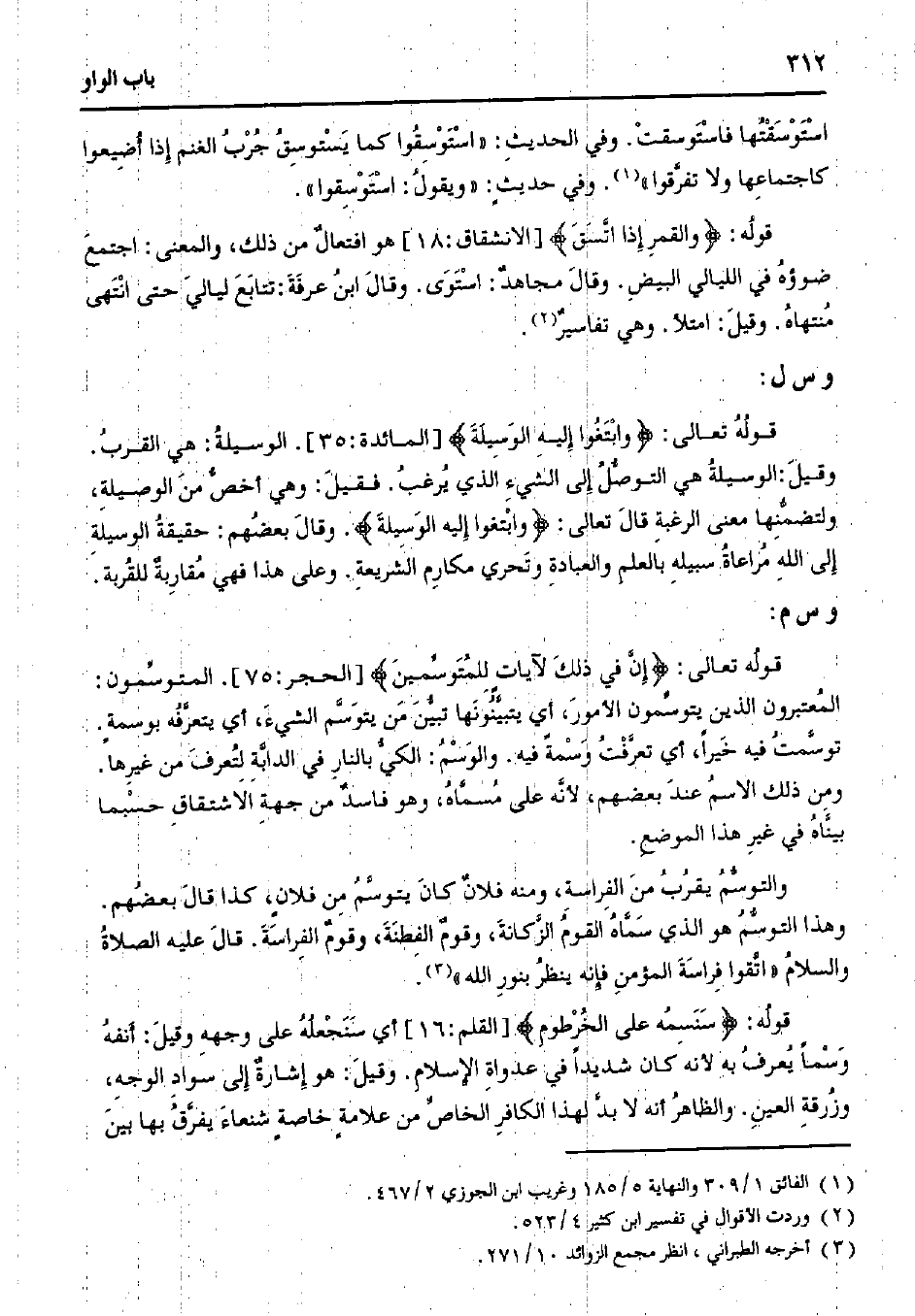 قوله تعالى: {إن في ذلك لآيات للمتوسمين} [الحجر: 75]. المتوسمون: المعتبرون الذين يتوسمون الأمور، أي يتبينونها تبين من يتوسم الشيء، أي يتعرفه بوسمةٍ. توسمت فيه خيرًا، أي تعرفت وسمةً فيه. والوسم: الكي بالنار في الدابة لتعرف من غيرها. ومن ذلك الاسم عند بعضهم، لأنه على مسماه، وهو فاسد من جهة الاشتقاق حسبما بيناه في غير هذا الموضع.