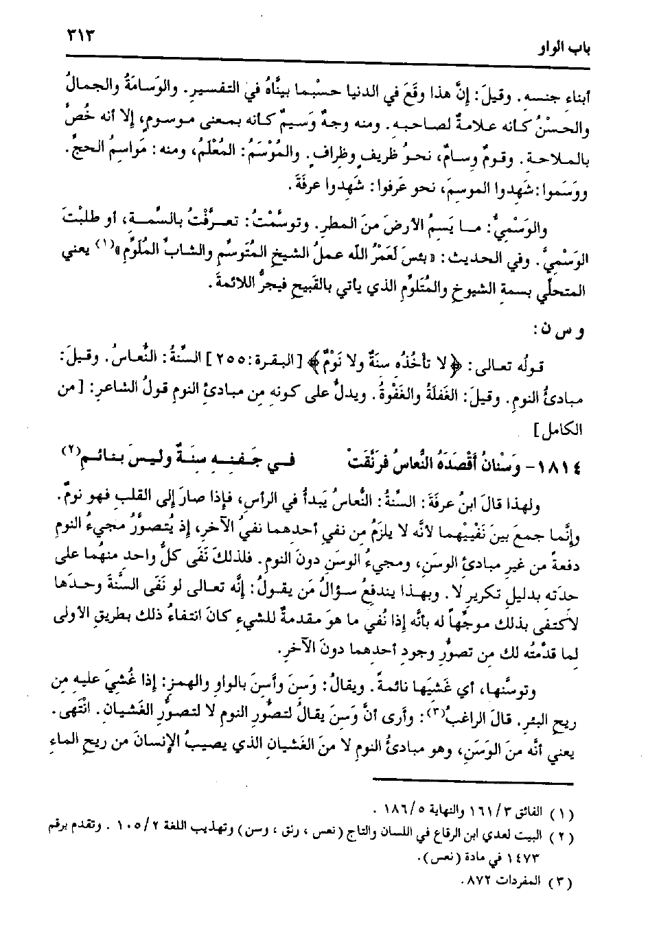 ولهذا قال ابن عرفة: السنة: النعاس يبدأ في الرأس، فإذا صار إلى القلب فهو نوم. وإنما جمع بين نفييهما لأنه لا يلزم من نفي أحدهما نفي الآخر، إذ يتصور مجيء النوم دفعةً من غير مبادئ الوسن، ومجيء الوسن دون النوم. فلذلك نفى كل واحد منهما على حدته بدليل تكرير لا. وبهذا يندفع سؤال من يقول: إنه تعالى لو نفى السنة وحدها لاكتفى بذلك موجهًا له بأنه إذا نفي ما هو مقدمة للشيء كان انتفاء ذلك بطريق الأولى لما قدمته لك من تصور وجود أحدهما دون الآخر.
