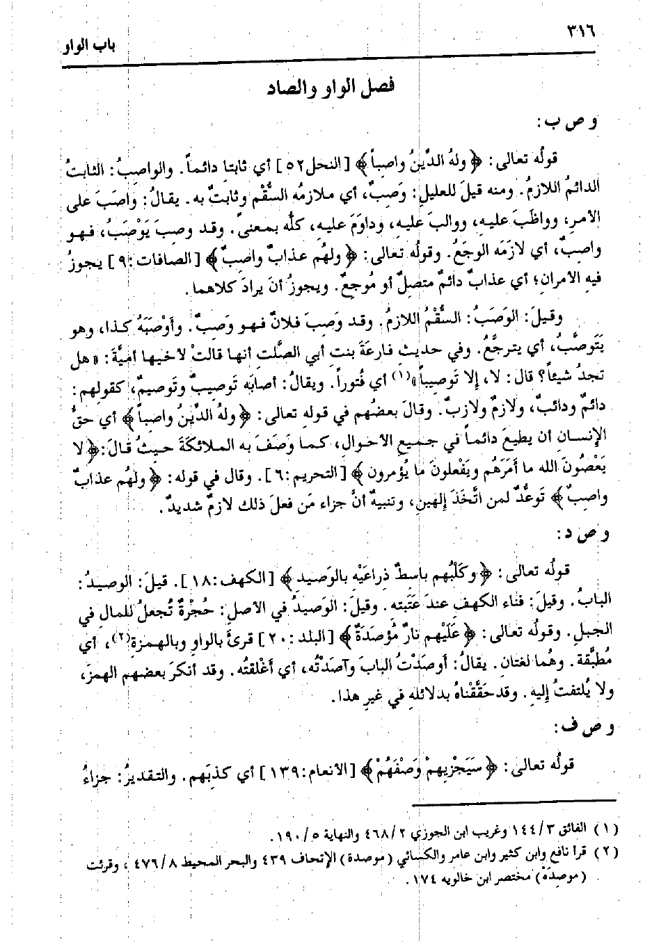 قوله تعالى: {وله الدين واصبًا} [النحل: 52] أي ثابتا دائمًا. والواصب: الثابت الدائم اللازم. ومنه قيل للعليل: وصب، أي ملازمه السقم وثابت به، يقال: واصب على الأمر، وواظب عليه، ووالب عليه، وداوم عليه، كله بمعنى. وقد وصب يوصب، فهو واصب، أي لازمه الوجع. وقوله تعالى: {ولهم عذاب واصب} [الصافات: 9] يجوز فيه الأمران؛ أي عذاب دائم متصل أو موجع. ويجوز أن يراد كلاهما.