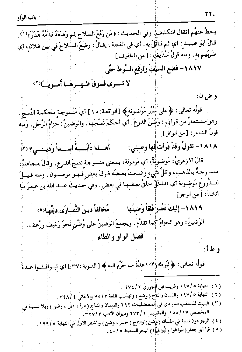 قال الأزهري: موضونة، أي مرمولة، بمعنى منسوجةٍ نسج الدرع. وقال مجاهد: منسوجة بالذهب، وكل شيءٍ وضعت بعضه فوق بعضٍ فهو موضون. ومنه قيل للدروع موضونة أي تداخل حلق بعضها في بعضٍ. وفي حديث عبد الله بن عمر ما أنشد: [من الرجز]