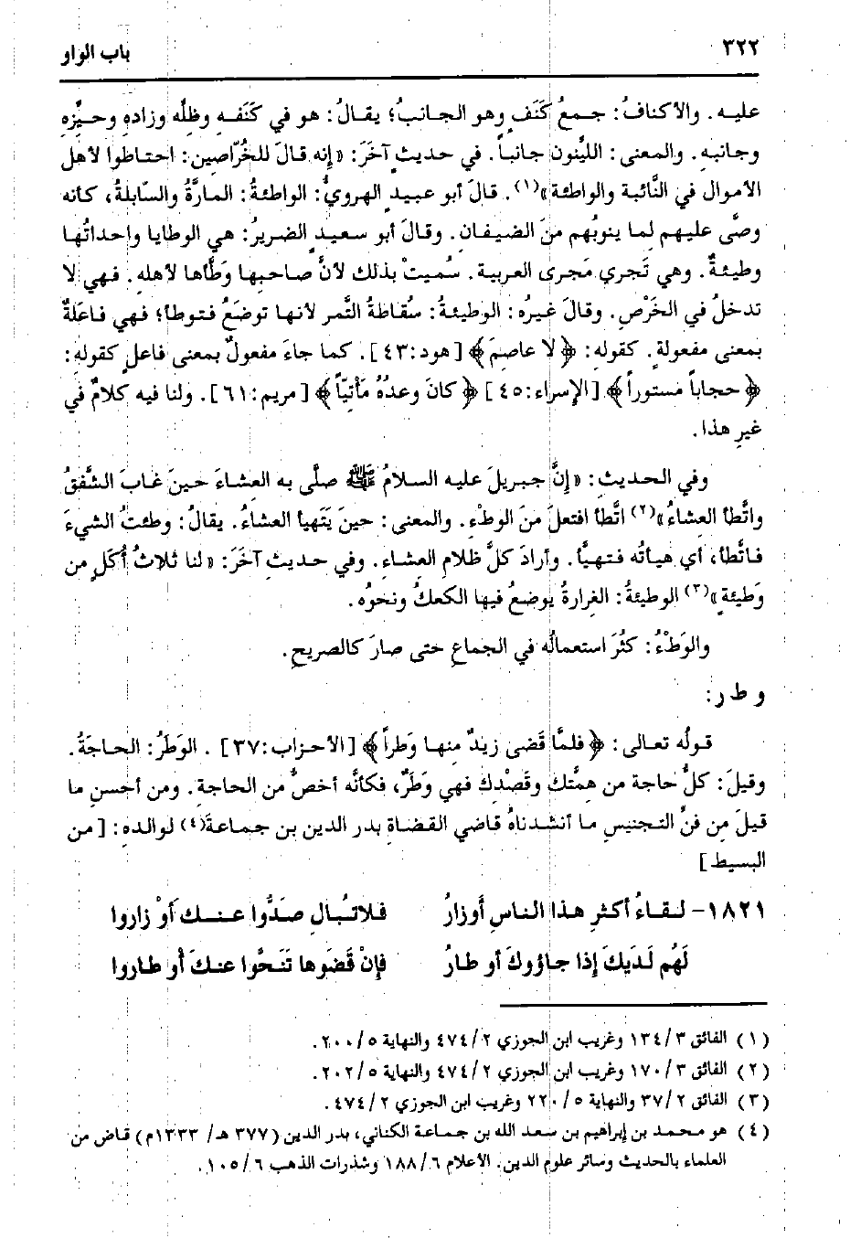 عليه. والأكناف: جمع كنفٍ وهو الجانب؛ يقال: هو في كنفه وظله وزاده وحيزه وجانبه. والمعنى: اللينون جانبًا. وفي حديثٍ آخر: "إنه قال للخراصين: احتاطوا لأهل الأموال في النائبة والوائطة". قال أبو عبيدٍ الهروي: الواطئة: المارة والسابلة، كأنه وصى عليهم لما ينوبهم من الضيفان. وقال أبو سعيدٍ الضرير: هي الوطايا واحداتها وطيئة. وهي تجري مجرى العربية. سميت بذلك لأن صاحبها وطأها لأهله. فهي لا تدخل في الخرص. وقال غيره: الوطيئة: سقاطة التمر لأنها توضع فتوطأ؛ فهي فاعلة بمعنى مفعولةٍ. كقوله: {لا عاصم} [هود: 43]. كما جاء مفعول بمعنى فاعلٍ كقوله: {حجابًا مستورًا} [الإسراء: 45] {كان وعده مأتيًا} [مريم: 61]. ولنا فيه كلام في غير هذا.