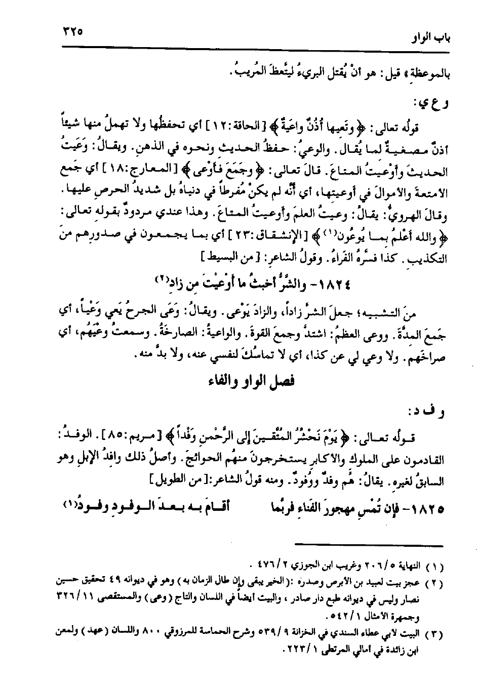 قوله تعالى: {وتعيها أذن واعية} [الحاقة: 12] أي تحفظها ولا تهمل منها شيئًا أذن مصغية لما يقال. والوعي: حفظ الحديث ونحوه في الذهن. ويقال: وعيت الحديث وأوعيت المتاع. قال تعالى: {وجمع فأوعى} [المعارج: 18] أي جمع الأمتعة والأموال في أوعيتها، أي أنه لم يكن مفرطًا في دنياه بل شديد الحرص عليها. وقال الهروي: يقال: وعيت العلم وأوعيت المتاع. وهذا عندي مردود بقوله تعالى: {والله أعلم بما يوعون} [الإنشقاق: 23] أي بما يجمعون في صدورهم من التكذيب. كذا فسره الفراء. وقول الشاعر: [من البسيط]