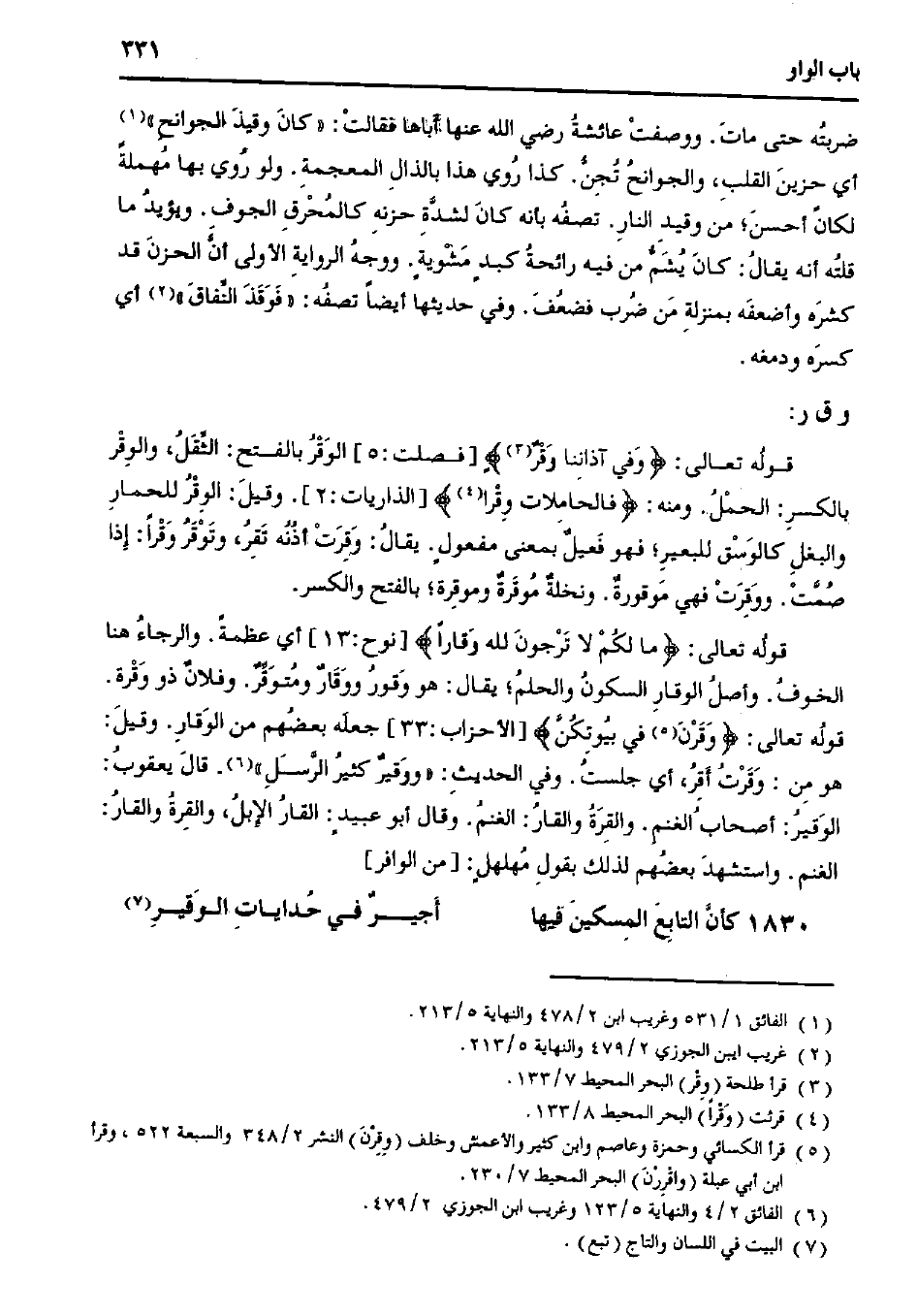 قوله تعالى: {ما لكم لا ترجون لله وقارًا} [نوح: 13] أي عظمة. والرجاء هنا الخوف. وأصل الوقار السكون والحلم؛ يقال: هو وقور ووقار ومتوقر. وفلان ذو وقرة. قوله تعالى: {وقرن في بيوتكن} [الأحزاب: 33] جعله بعضهم من الوقار. وقيل: هو من: وقرت أقر، أي جلست. وفي الحديث: "ووقير كثير الرسل". قال يعقوب: الوقير: أصحاب الغنم. والقرة والقار: الغنم. وقال أبو عبيدٍ: القار الإبل، والقرة والقار: الغنم. واستشهد بعضهم لذلك بقول مهلهلٍ: [من الوافر]