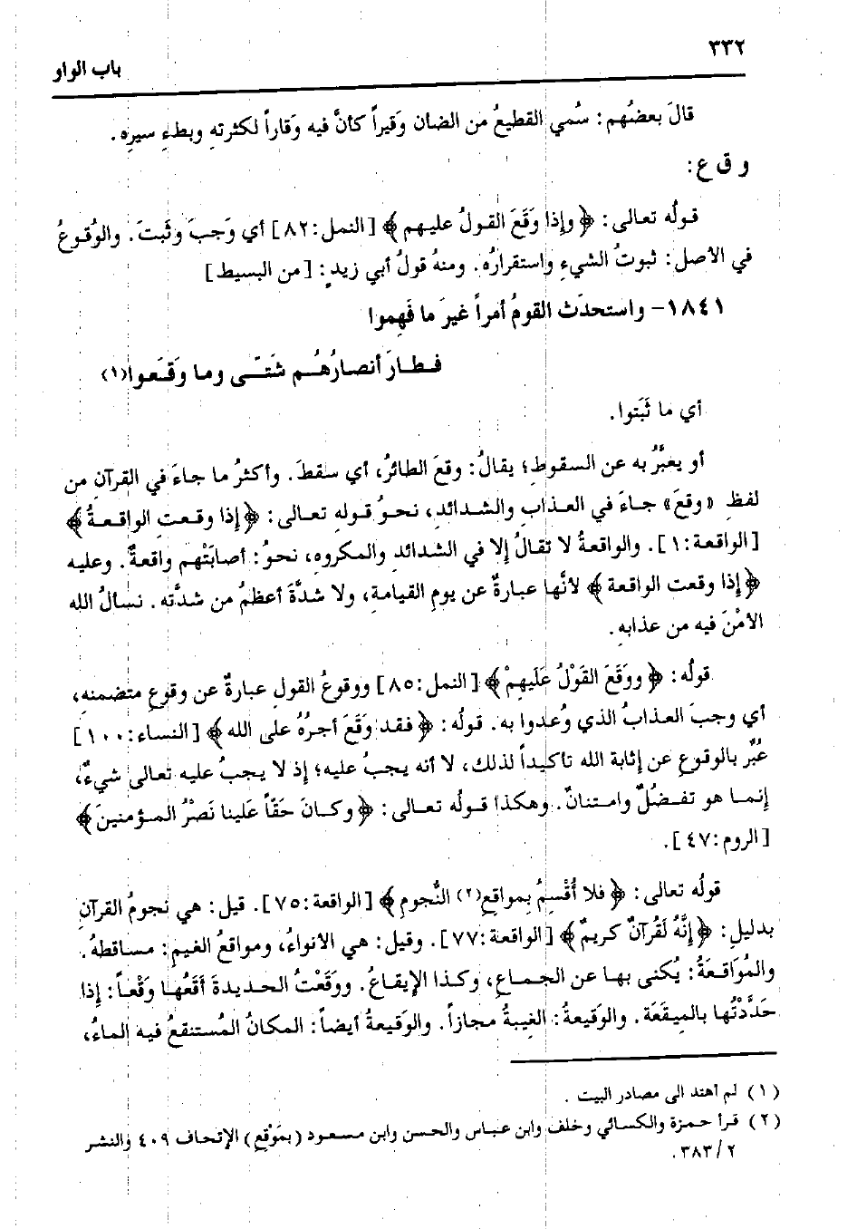 قوله تعالى: {فلا أقسم بمواقع النجوم} [الواقعة: 75]. قيل: هي نجوم القرآن بدليل: {إنه لقرآن كريم} [الواقعة: 77]. وقيل: هي الأنواء، ومواقع الغيم: مساقطه. والمواقعة: يكنى بها عن الجماع، وكذا الإيقاع. ووقعت الحديدة أقعها وقعًا: إذا حددتها بالميقعة. والوقيعة: الغيبة مجازًا. والوقيعة أيضًا: المكان المستنقع فيه الماء،