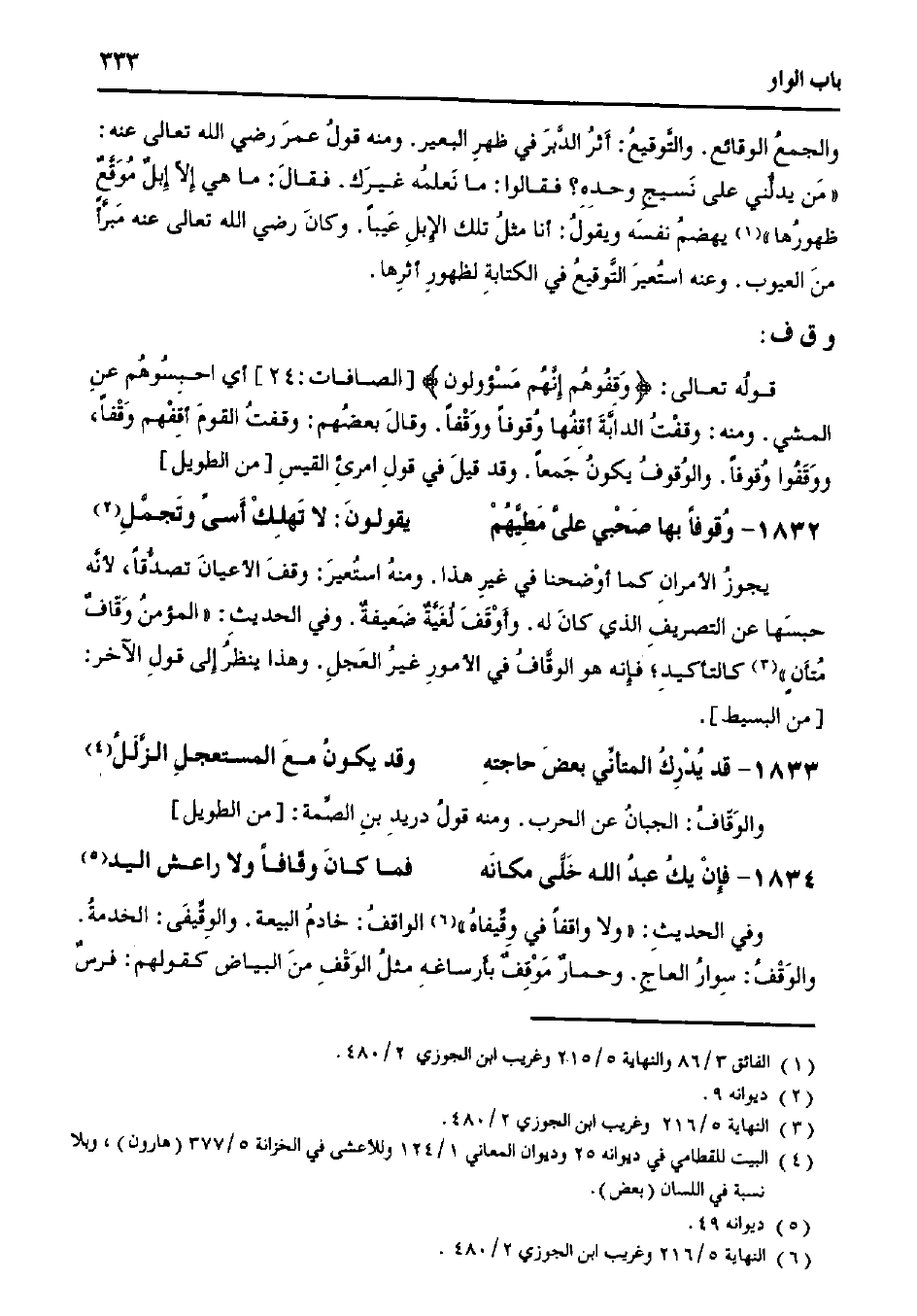 قوله تعالى: {وقفوهم إنهم مسؤولون} [الصافات: 24] أي احبسهوهم عن المشي. ومنه: وقفت الدابة أقفها وقوفًا ووقفًا. وقال بعضهم: وقفت القوم أقفهم وقفًا، ووقفوا وقوفًا. والوقوف يكون جمعًا. وقد قيل في قول امرئ القيس [من الطويل]