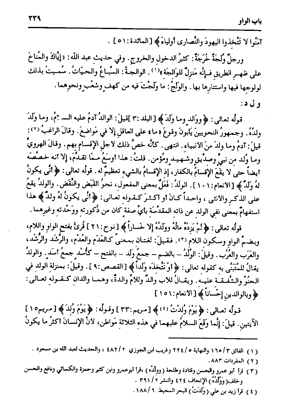 قوله تعالى: {لم يزده ماله وولده إلا خسارًا} [نوح: 21] قرئ بفتح الواو واللام، وبضم الواو وسكون اللام. فقيل: لغتان بمعنى كالعدم والعدم، والرشد والرشد، والعرب والعرب. وقيل: الولد - بالضم - جمع ولد - بالفتح - كأسدٍ جمع أسدٍ. والولد يقال للمتبنى به كقوله تعالى: {أو نتخذه ولدًا} [القصص: 9]. وقيل: بمنزلة الولد في الحنو والشفقة عليه. ويقال للأب والد وللأم والدة، وهما والدان كقوله تعالى: {وبالوالدين إحسانًا} [الأنعام: 151]