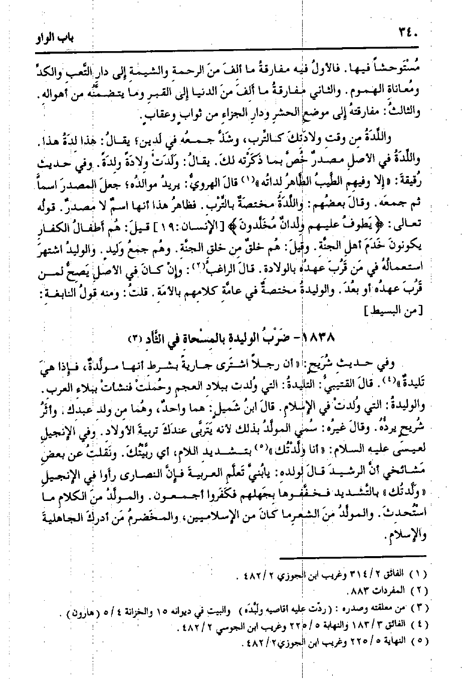 وفي حديث شريحٍ: «أن رجلًا اشترى جارية بشرط أنها مولدة، فإذا هي تليدة». قال القتيبي: التليدة: التي ولدت ببلاد العجم وحملت فنشأت ببلاء العرب. والوليدة: التي ولدت في الإسلام. قال ابن شميلٍ: هما واحد، وهما من ولد عبدك. وأثر شريحٍ يرده. وقال غيره: سمي المولد بذلك لأنه يتربى عندك تربية الأولاد. وفي الإنجيل لعيسى عليه السلام: «أنا ولدتك» بتشديد اللام، أي ربيتك. ونقلت عن بعض مشائخي أن الرشيد قال لولده: يابني تعلم العربية فإن النصارى رأوا في الإنجيل «ولدتك» بالتشديد فخففوها بجهلهم فكفروا أجمعون. والمولد من الكلام ما استحدث. والمولد من الشعر ما كان من الإسلاميين، والمخضرم من أدرك الجاهلية والإسلام.
