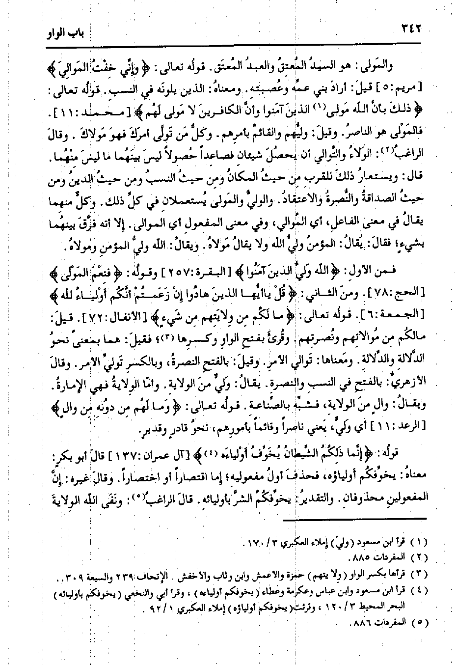 فمن الأول: {الله ولي الذين آمنوا} [البقرة:257] وقوله: {فنعم المولى} [الحج: 78]. ومن الثاني: {قل ياأيها الذين هادوا إن زعمتم أنكم أولياء لله} [الجمعة: 6]. قوله تعالى: {ما لكم من ولايتهم من شيءٍ} [الأنفال: 72]. قيل: ما لكم من موالاتهم ونصرتهم. وقرئ بفتح الواو وكسرها؛ فقيل: هما بمعنى نحو الدلالة والدلالة. ومعناها: توالي الأمر. وقيل: بالفتح النصرة، وبالكسر تولي الأمر. وقال الأزهري: بالفتح في النسب والنصرة. يقال: ولي من الولاية. وأما الولاية فهي الإمارة. ويقال: والٍ من الولاية، فشبه بالصناعة. قوله تعالى: {وما لهم من دونه من والٍ} [الرعد: 11] أي ولي، يعني ناصرًا وقائمًا بأمورهم، نحو قادرٍ وقديرٍ.