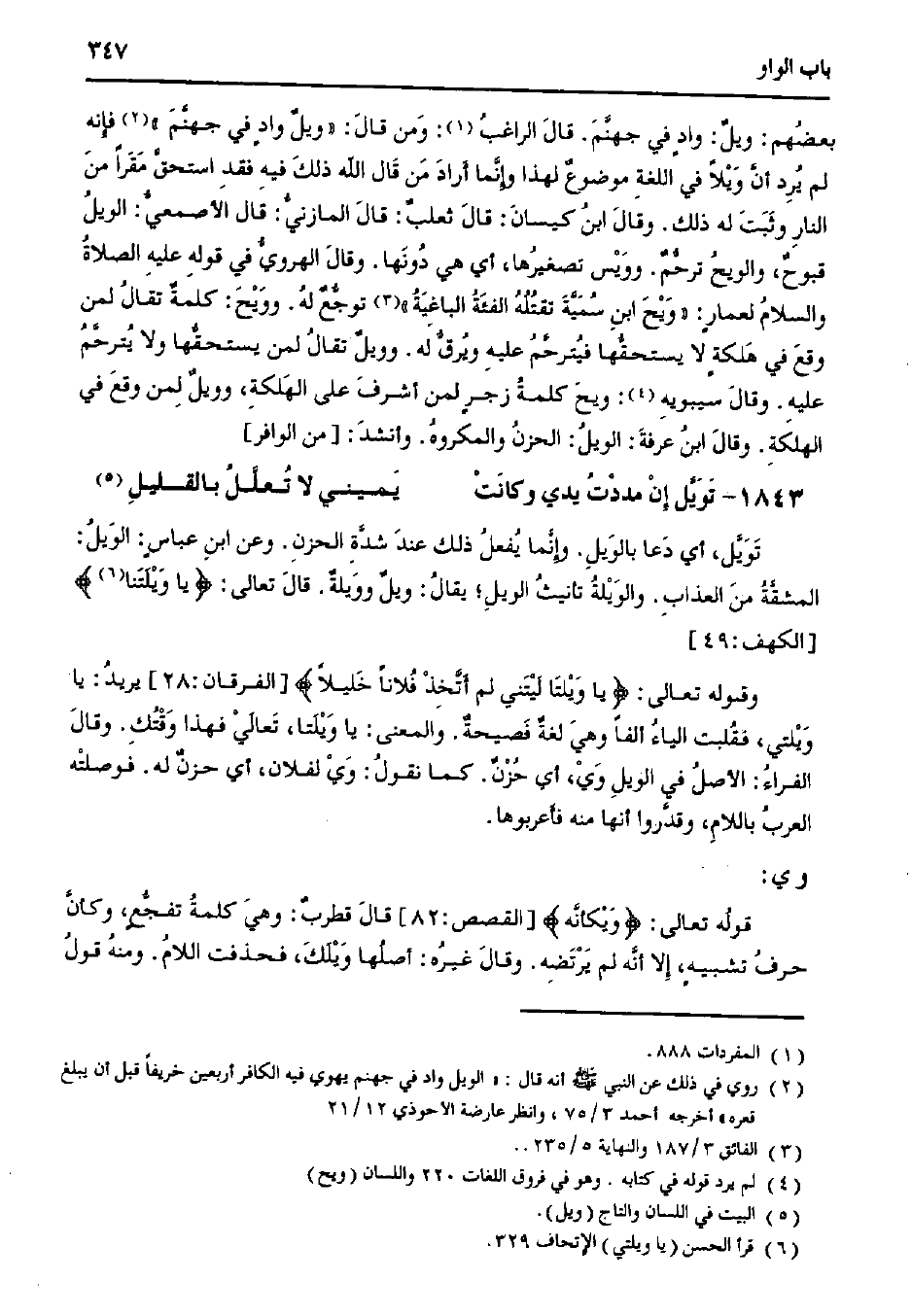 بعضهم: ويل: وادٍ في جهنم. قال الراغب: ومن قال: «ويل وادٍ في جهنم» فإنه لم يرد أن ويلًا في اللغة موضوع لهذا وإنما أراد من قال الله ذلك فيه فقد استحق مقرًا من النار وثبت له ذلك. وقال ابن كيسان: قال ثعلب: قال المازني: قال الأصمعي: الويل قبوح، والويح ترحم. وويس تصغيرها، أي هي دونها. وقال الهروي في قوله عليه الصلاة والسلام لعمارٍ: «ويح ابن سمية تقتله الفئة الباغية» توجع له. وويح: كلمة تقال لمن وقع في هلكة لا يستحقها فيترحم عليه ويرق له. وويل تقال لمن يستحقها ولا يترحم عليه. وقال سيبويه: ويح كلمة زجرٍ لمن أشرف على الهلكة، وويل لمن رقع في الهلكة. وقال ابن عرفة: الويل: الحزن والمكروه. وأنشد: [من الوافر]